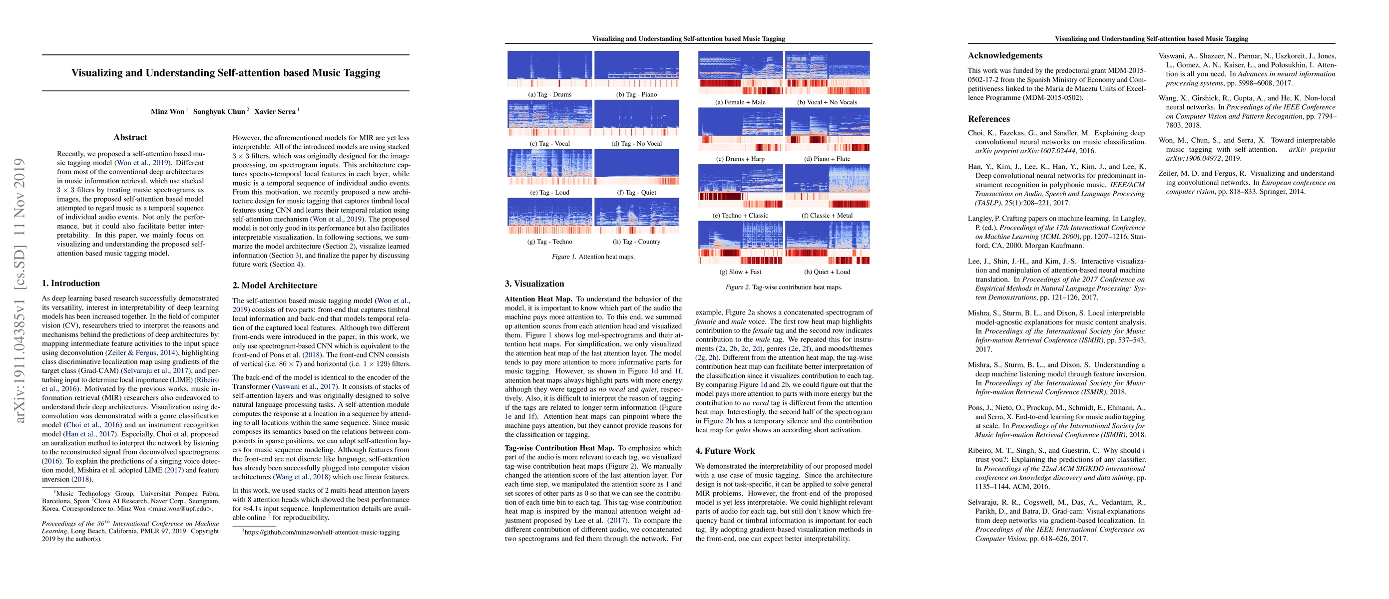 This paper proposes a self-attention based model for music tagging that treats music as temporal sequences rather than images, aiming for better performance and interpretability. The study focuses on visualizing and understanding this innovative approach.