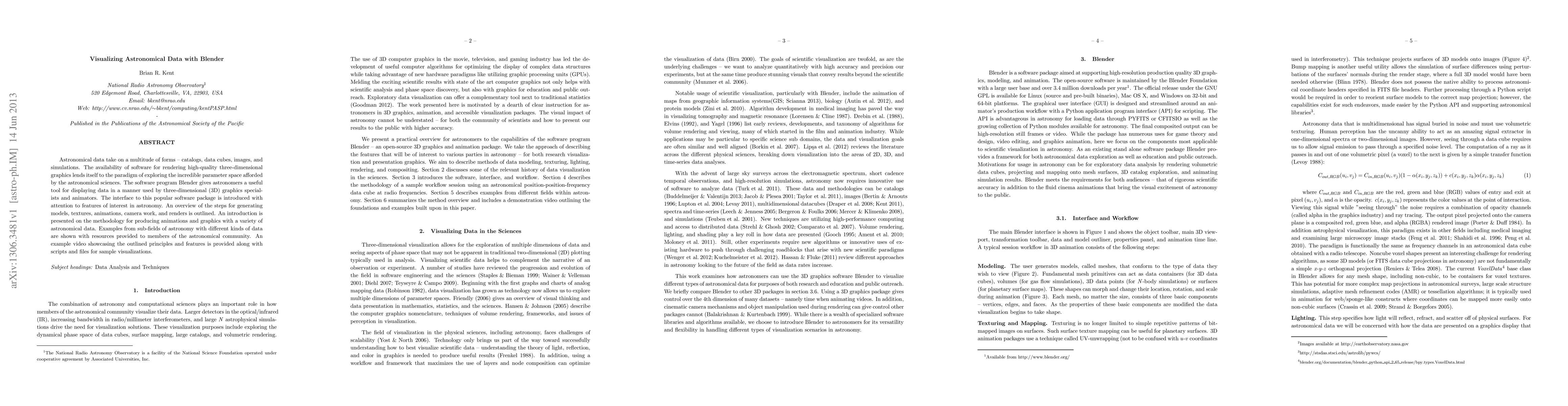 This paper introduces Blender as a tool for visualizing astronomical data, outlining steps for generating models, textures, and animations. It provides examples from various sub-fields of astronomy and includes resources and sample visualizations to aid the astronomical community.