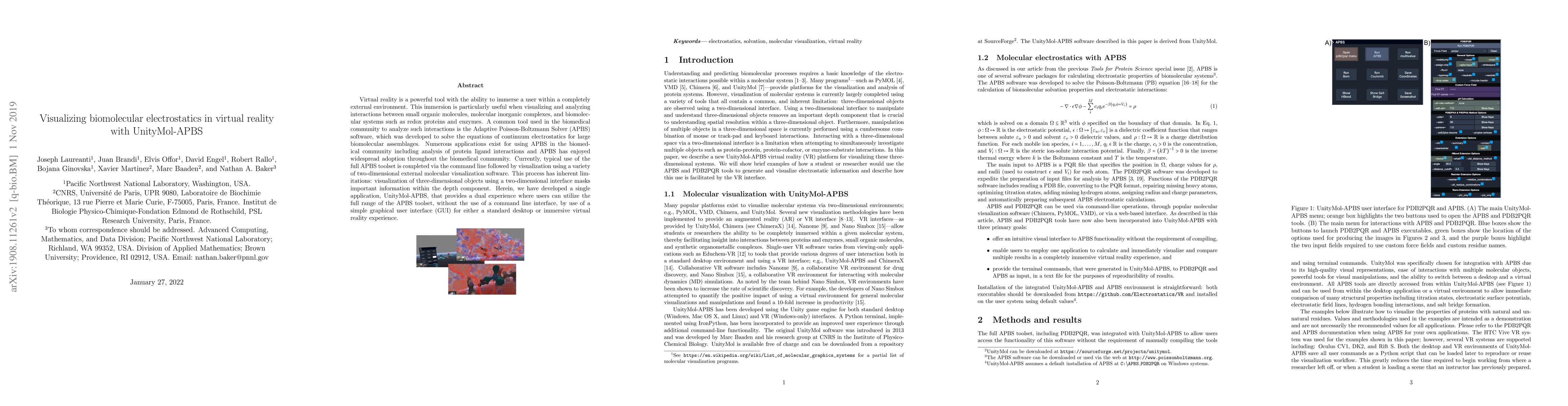 Virtual reality is a powerful tool with the ability to immerse a user within a completely external environment. This immersion is particularly useful when visualizing and analyzing interactions between small organic molecules, molecular inorganic complexes, and biomolecular systems such as redox proteins and enzymes. A common tool used in the biomedical community to analyze such interactions is the APBS software, which was developed to solve the equations of continuum electrostatics for large biomolecular assemblages. Numerous applications exist for using APBS in the biomedical community including analysis of protein ligand interactions and APBS has enjoyed widespread adoption throughout the biomedical community. Currently, typical use of the full APBS toolset is completed via the command line followed by visualization using a variety of two-dimensional external molecular visualization software. This process has inherent limitations: visualization of three-dimensional objects using a two-dimensional interface masks important information within the depth component. Herein, we have developed a single application, UnityMol-APBS, that provides a dual experience where users can utilize the full range of the APBS toolset, without the use of a command line interface, by use of a simple \ac{GUI} for either a standard desktop or immersive virtual reality experience.