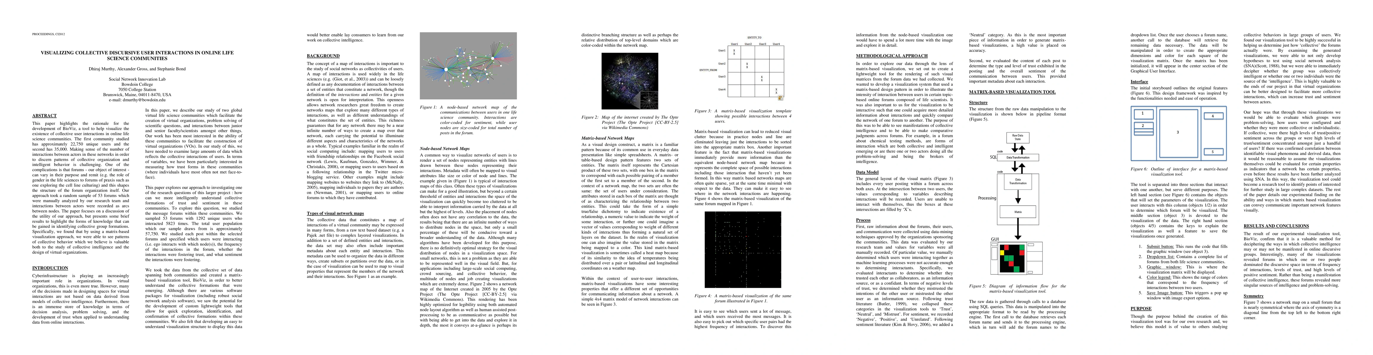 This paper highlights the rationale for the development of BioViz, a tool to help visualize the existence of collective user interactions in online life science communities. The first community studied has approximately 22,750 unique users and the second has 35,000. Making sense of the number of interactions between actors in these networks in order to discern patterns of collective organization and intelligent behavior is challenging. One of the complications is that forums - our object of interest - can vary in their purpose and remit (e.g. the role of gender in the life sciences to forums of praxis such as one exploring the cell line culturing) and this shapes the structure of the forum organization itself. Our approach took a random sample of 53 forums which were manually analyzed by our research team and interactions between actors were recorded as arcs between nodes. The paper focuses on a discussion of the utility of our approach, but presents some brief results to highlight the forms of knowledge that can be gained in identifying collective group formations. Specifically, we found that by using a matrix-based visualization approach, we were able to see patterns of collective behavior which we believe is valuable both to the study of collective intelligence and the design of virtual organizations.