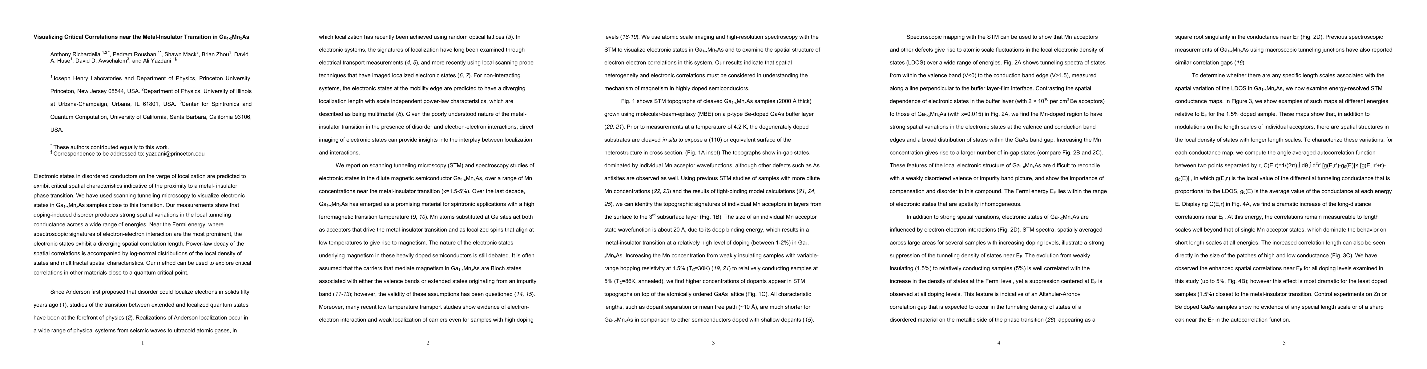 Electronic states in disordered conductors on the verge of localization are predicted to exhibit critical spatial characteristics indicative of the proximity to a metal- insulator phase transition. We have used scanning tunneling microscopy to visualize electronic states in Ga1-xMnxAs samples close to this transition. Our measurements show that doping-induced disorder produces strong spatial variations in the local tunneling conductance across a wide range of energies. Near the Fermi energy, where spectroscopic signatures of electron-electron interaction are the most prominent, the electronic states exhibit a diverging spatial correlation length. Power-law decay of the spatial correlations is accompanied by log-normal distributions of the local density of states and multifractal spatial characteristics. Our method can be used to explore critical correlations in other materials close to a quantum critical point.