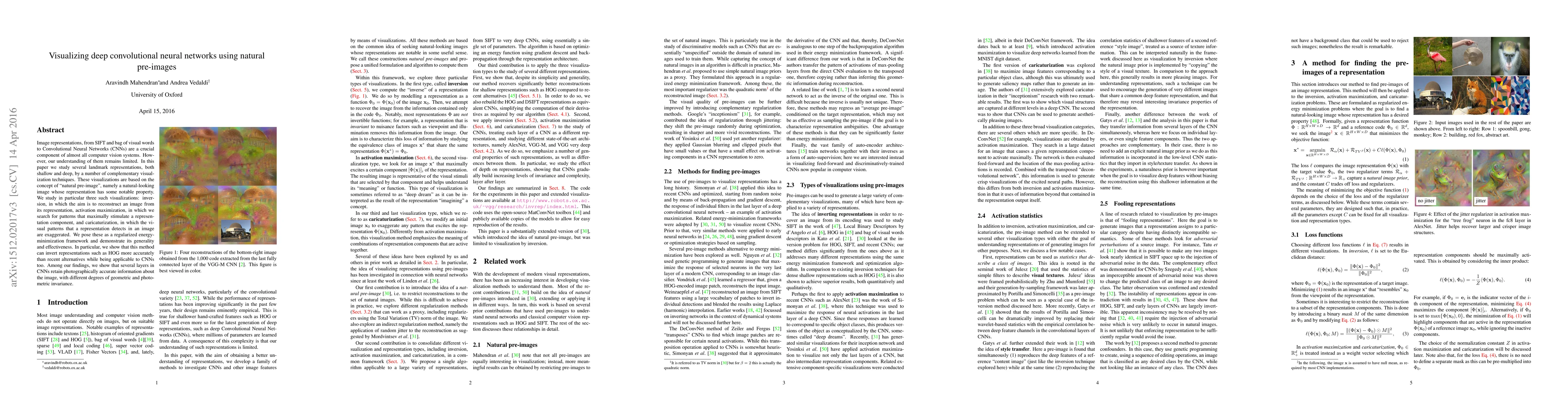 This paper explores visualization techniques for understanding deep Convolutional Neural Networks (CNNs) using natural pre-images, focusing on inversion, activation maximization, and caricaturization. It demonstrates the effectiveness of these methods in revealing how different layers in CNNs retain photographically accurate image information with varying degrees of invariance.