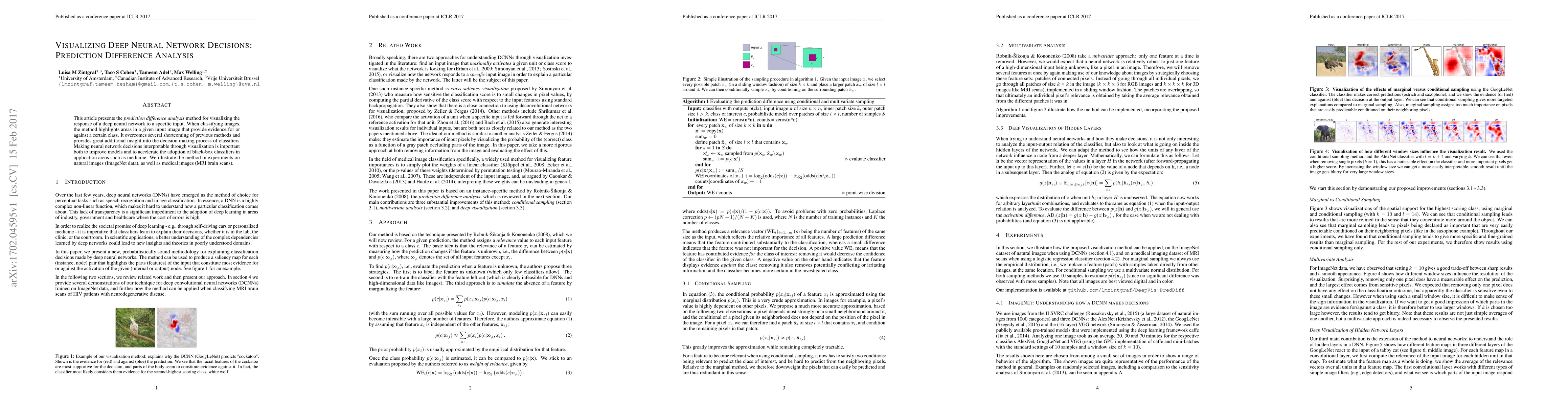 This paper introduces a prediction difference analysis method to visualize deep neural networks' decision-making by highlighting image areas influencing class predictions. It provides interpretability for neural network classifiers, aiding model improvement and adoption in fields like medicine.