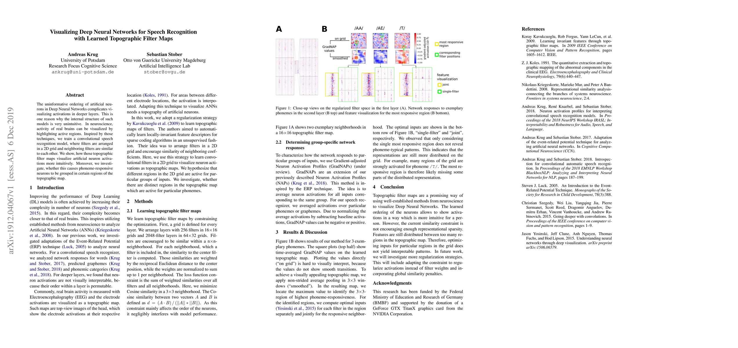 The uninformative ordering of artificial neurons in Deep Neural Networks complicates visualizing activations in deeper layers. This is one reason why the internal structure of such models is very unintuitive. In neuroscience, activity of real brains can be visualized by highlighting active regions. Inspired by those techniques, we train a convolutional speech recognition model, where filters are arranged in a 2D grid and neighboring filters are similar to each other. We show, how those topographic filter maps visualize artificial neuron activations more intuitively. Moreover, we investigate, whether this causes phoneme-responsive neurons to be grouped in certain regions of the topographic map.