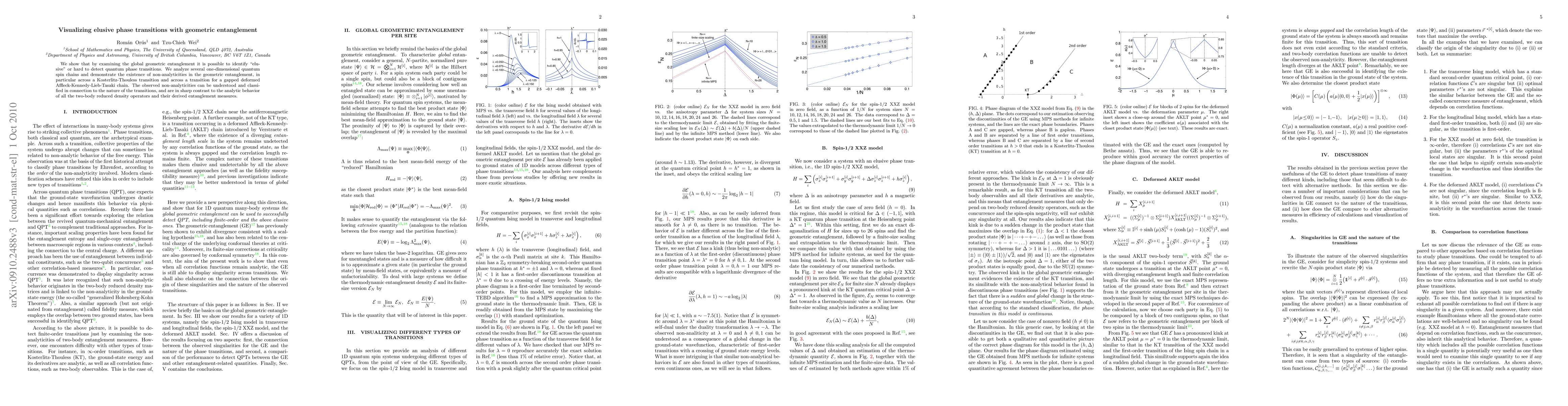 This paper demonstrates that global geometric entanglement can reveal elusive quantum phase transitions, exemplified by non-analyticities observed across Kosterlitz-Thouless and gapped deformed Affleck-Kennedy-Lieb-Tasaki transitions in one-dimensional quantum spin chains, contrasting with the analytic behavior of two-body reduced density operators.
