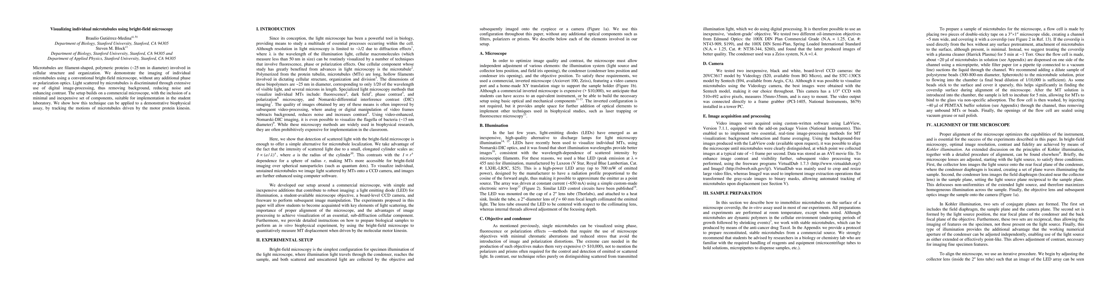 This paper presents a method to visualize individual microtubules using conventional bright-field microscopy, enhanced by digital image processing to remove background noise and improve contrast. The technique is cost-effective and suitable for student laboratories, demonstrating its application in tracking microtubule motions driven by kinesin.