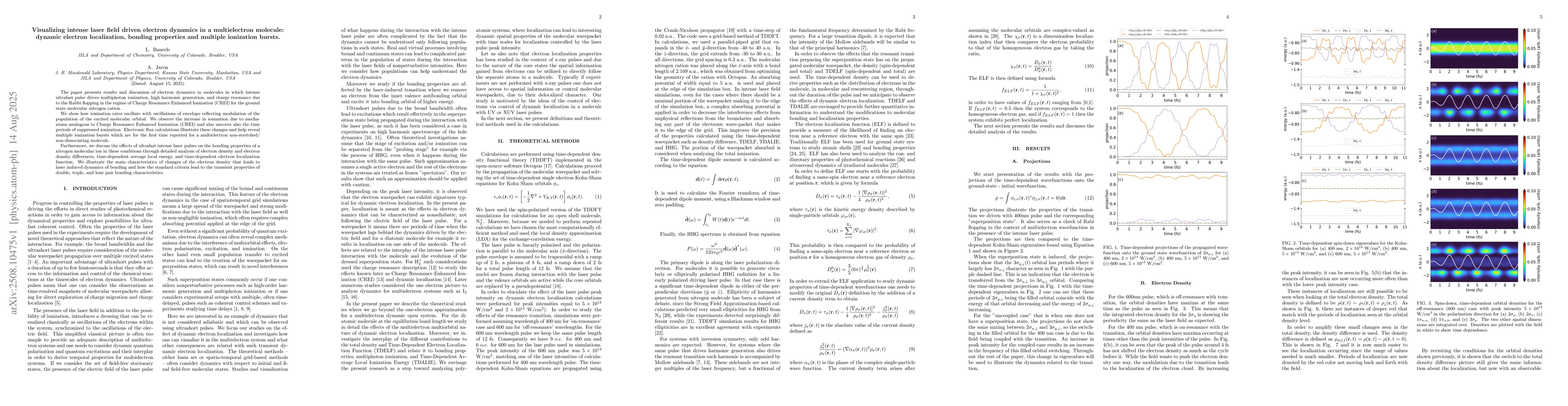 The paper presents results and discussion of electron dynamics in molecules in which intense ultrafast pulse drives multiphoton ionization, high harmonic generation, and charge resonance due to the Rabbi flopping in the regime of Charge Resonance Enhanced Ionization (CREI) for the ground state molecular nitrogen cation. We show how ionization rates oscillate with oscillations of envelope reflecting modulation of the population of the excited molecular orbital. We observe the increase in ionization due to mechanisms analogous to Charge Resonance Enhanced Ionization (CREI) and also uncover also the time periods of suppressed ionization. Electronic flux calculations illustrate these changes and help reveal multiple ionization bursts which are for the first time reported for a multielectron non-stretched/ non-dissociating molecule. Furthermore, we discuss the effects of ultrafast intense laser pulses on the bonding properties of a nitrogen molecular ion in these conditions through detailed analysis of electron density and electron density differences, time-dependent average local energy, and time-dependent electron localization function. We illustrate the main characteristics of changes of the electron density that leads to laser induced dynamics of bonding and how the standard criteria lead to the transient properties of double, triple, and lone pair bonding characteristics.