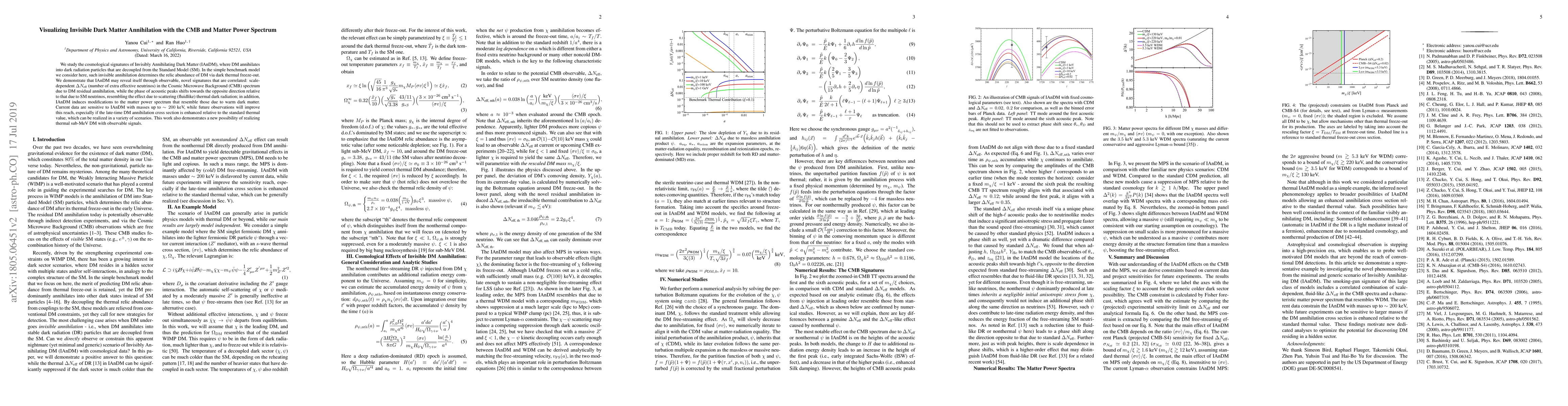 We study the cosmological signatures of Invisibly Annihilating Dark Matter (IAnDM), where DM annihilates into dark radiation particles that are decoupled from the Standard Model (SM). In the simple benchmark model we consider here, such invisible annihilation determines the relic abundance of DM via dark thermal freeze-out. We demonstrate that IAnDM may reveal itself through observable, novel signatures that are correlated: scale-dependent $\Delta N_\text{eff}$ (number of extra effective neutrinos) in the Cosmic Microwave Background (CMB) spectrum due to DM residual annihilation, while the phase of acoustic peaks shifts towards the opposite direction relative to that due to SM neutrinos, resembling the effect due to scattering (fluidlike) thermal dark radiation; in addition, IAnDM induces modifications to the matter power spectrum that resemble those due to warm dark matter. Current data are sensitive to IAnDM with masses up to $\sim200$ keV, while future observations will improve this reach, especially if the late-time DM annihilation cross section is enhanced relative to the standard thermal value, which can be realized in a variety of scenarios. This work also demonstrates a new possibility of realizing thermal sub-MeV DM with observable signals.