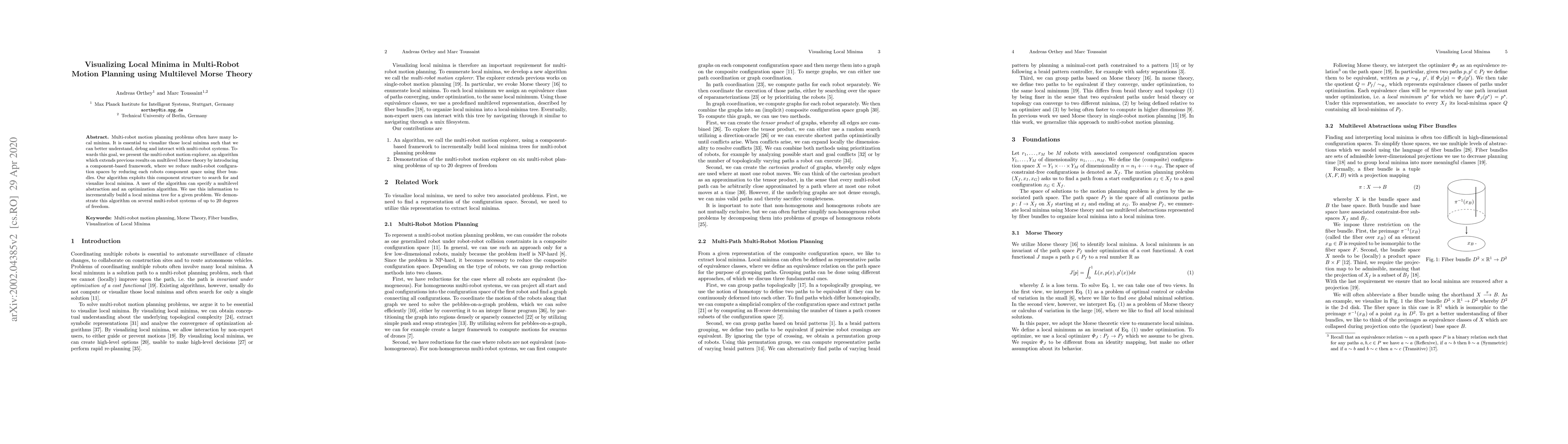 Multi-robot motion planning problems often have many local minima. It is essential to visualize those local minima such that we can better understand, debug and interact with multi-robot systems. Towards this goal, we present the multi-robot motion explorer, an algorithm which extends previous results on multilevel Morse theory by introducing a component-based framework, where we reduce multi-robot configuration spaces by reducing each robots component space using fiber bundles. Our algorithm exploits this component structure to search for and visualize local minima. A user of the algorithm can specify a multilevel abstraction and an optimization algorithm. We use this information to incrementally build a local minima tree for a given problem. We demonstrate this algorithm on several multi-robot systems of up to 20 degrees of freedom.