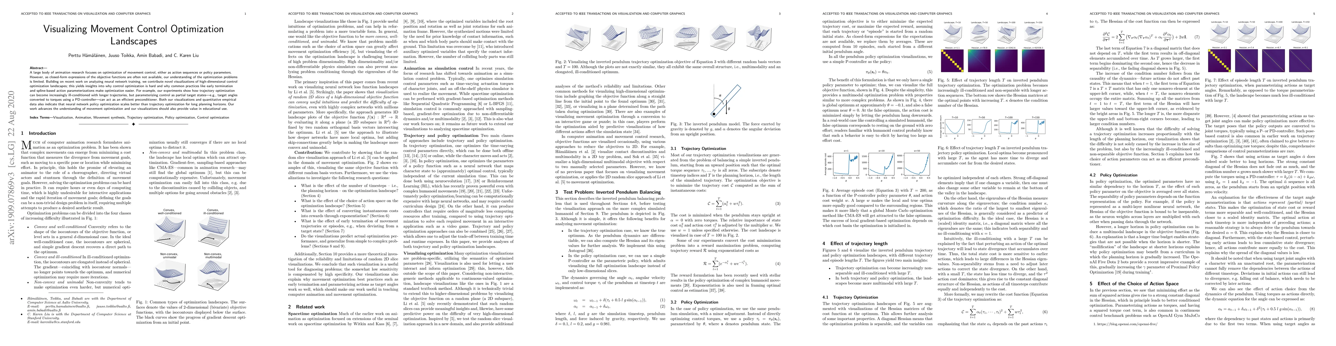 Researchers created visualizations of high-dimensional movement control optimization landscapes to understand why optimization is hard and how common practices can make it easier. Their work suggests that neural network policy optimization scales better than trajectory optimization for long planning horizons.