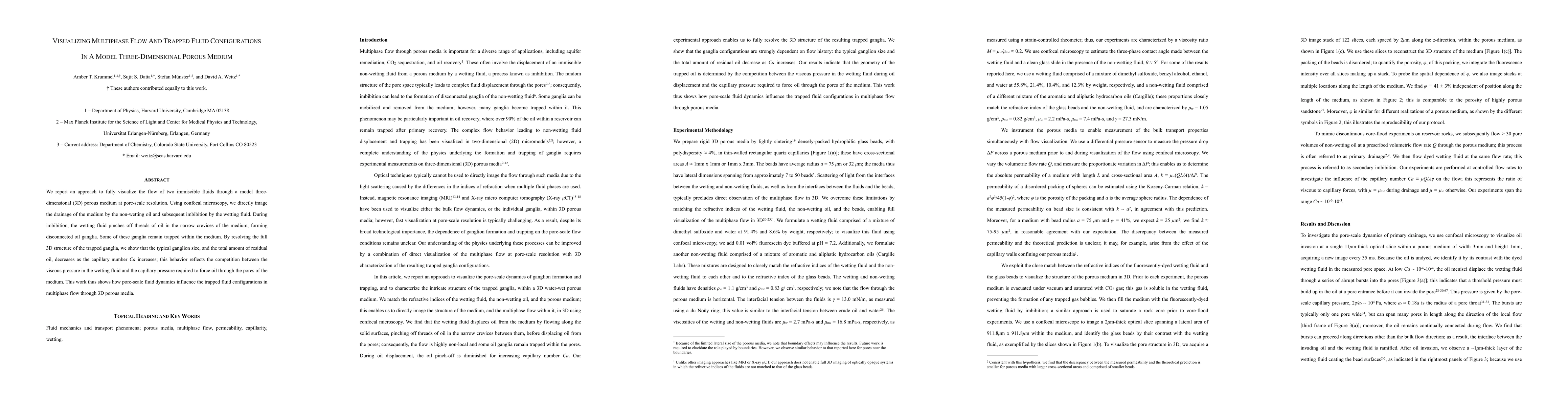 This study employs confocal microscopy to visualize the detailed flow of two immiscible fluids through a 3D porous medium, revealing how trapped oil ganglia size and quantity decrease with increasing capillary number, highlighting the interplay between viscous and capillary forces in multiphase flow.