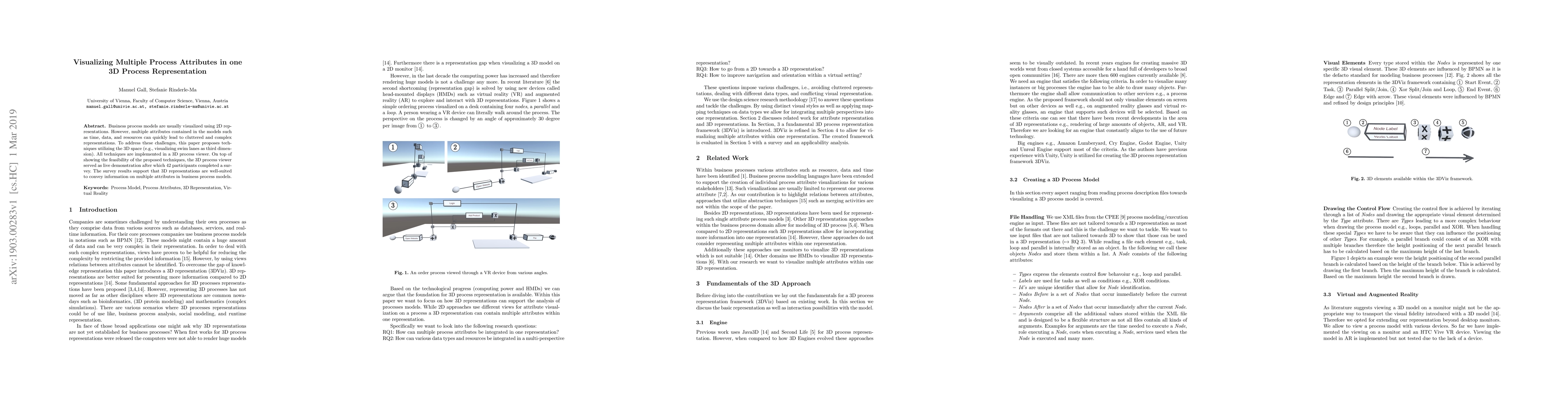 Business process models are usually visualized using 2D representations. However, multiple attributes contained in the models such as time, data, and resources can quickly lead to cluttered and complex representations. To address these challenges, this paper proposes techniques utilizing the 3D space (e.g., visualizing swim lanes as third dimension). All techniques are implemented in a 3D process viewer. On top of showing the feasibility of the proposed techniques, the 3D process viewer served as live demonstration after which 42 participants completed a survey. The survey results support that 3D representations are well-suited to convey information on multiple attributes in business process models.