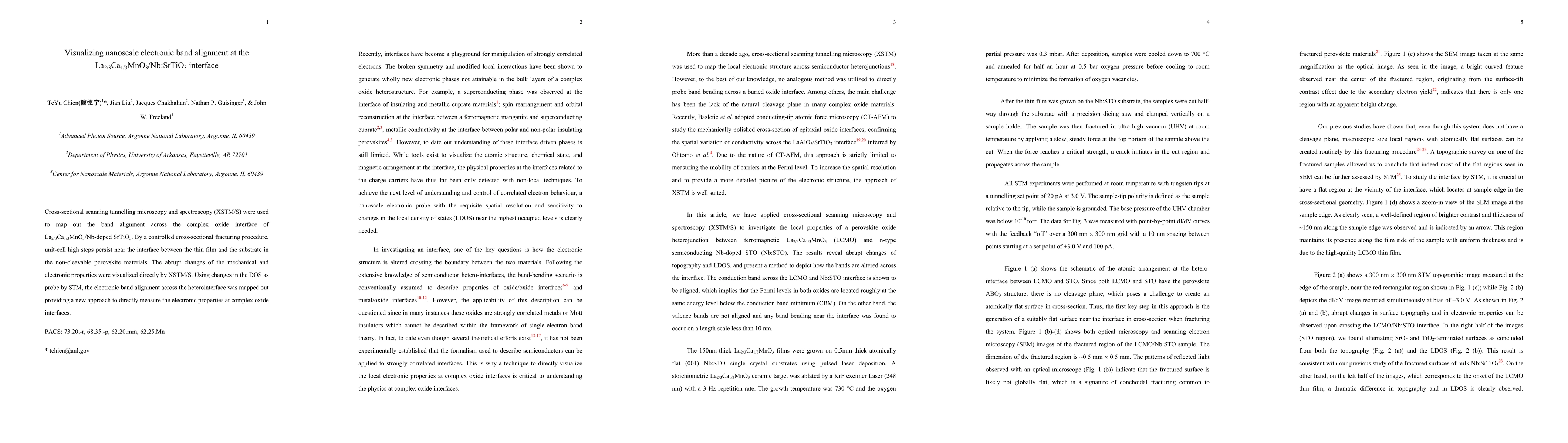 The paper presents a method using cross-sectional scanning tunneling microscopy and spectroscopy (XSTM/S) to visualize and map electronic band alignment at the La2/3Ca1/3MnO3/Nb-doped SrTiO3 interface. By employing a controlled fracturing procedure, unit-cell high steps near the interface were maintained, allowing for direct visualization of abrupt changes in mechanical and electronic properties. This novel approach offers a new way to directly measure electronic properties at complex oxide interfaces.