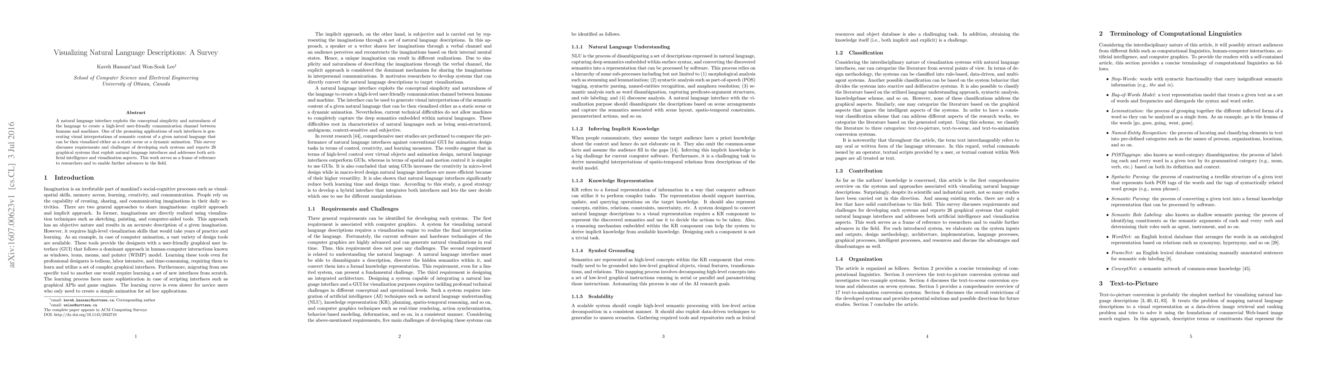 A natural language interface exploits the conceptual simplicity and naturalness of the language to create a high-level user-friendly communication channel between humans and machines. One of the promising applications of such interfaces is generating visual interpretations of semantic content of a given natural language that can be then visualized either as a static scene or a dynamic animation. This survey discusses requirements and challenges of developing such systems and reports 26 graphical systems that exploit natural language interfaces and addresses both artificial intelligence and visualization aspects. This work serves as a frame of reference to researchers and to enable further advances in the field.