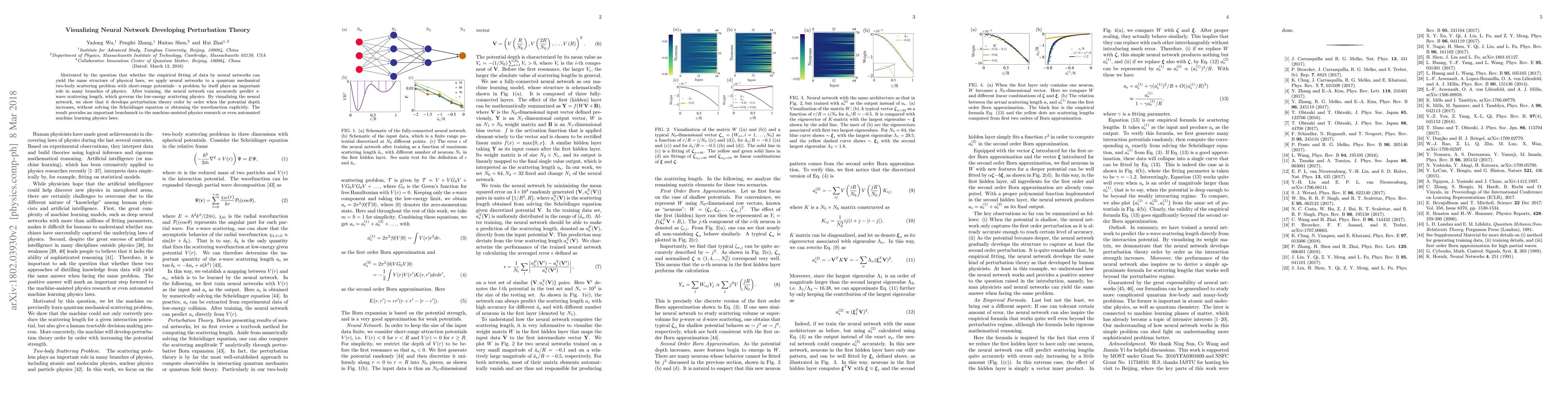 In this letter, motivated by the question that whether the empirical fitting of data by neural network can yield the same structure of physical laws, we apply the neural network to a simple quantum mechanical two-body scattering problem with short-range potentials, which by itself also plays an important role in many branches of physics. We train a neural network to accurately predict $ s $-wave scattering length, which governs the low-energy scattering physics, directly from the scattering potential without solving Schr\"odinger equation or obtaining the wavefunction. After analyzing the neural network, it is shown that the neural network develops perturbation theory order by order when the potential increases. This provides an important benchmark to the machine-assisted physics research or even automated machine learning physics laws.