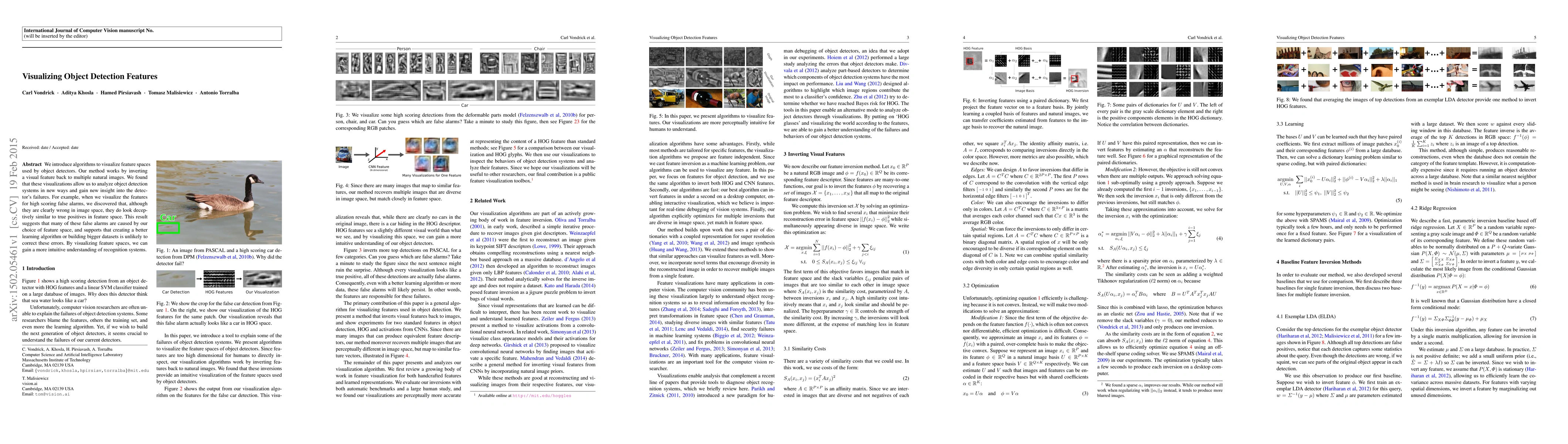 We introduce algorithms to visualize feature spaces used by object detectors. Our method works by inverting a visual feature back to multiple natural images. We found that these visualizations allow us to analyze object detection systems in new ways and gain new insight into the detector's failures. For example, when we visualize the features for high scoring false alarms, we discovered that, although they are clearly wrong in image space, they do look deceptively similar to true positives in feature space. This result suggests that many of these false alarms are caused by our choice of feature space, and supports that creating a better learning algorithm or building bigger datasets is unlikely to correct these errors. By visualizing feature spaces, we can gain a more intuitive understanding of recognition systems.