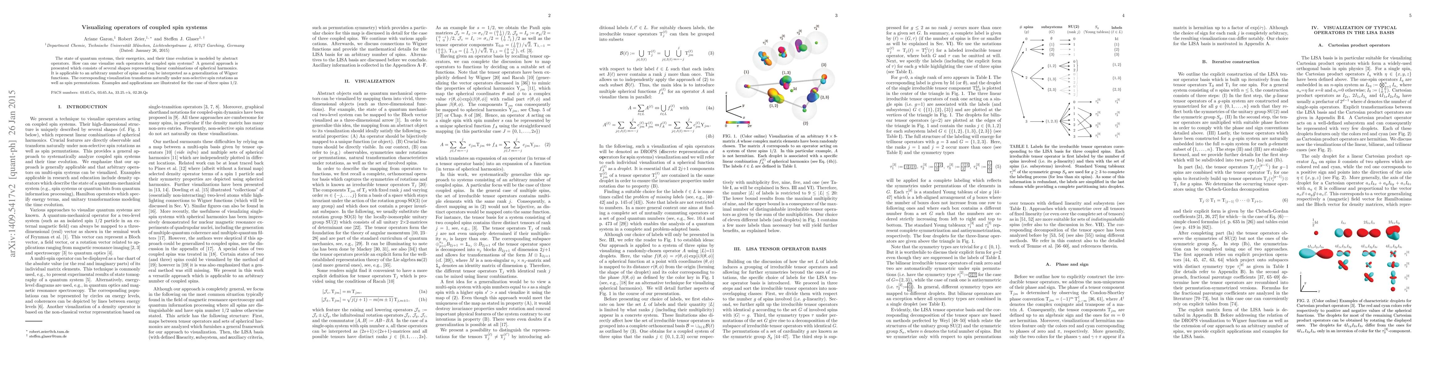 The state of quantum systems, their energetics, and their time evolution is modeled by abstract operators. How can one visualize such operators for coupled spin systems? A general approach is presented which consists of several shapes representing linear combinations of spherical harmonics. It is applicable to an arbitrary number of spins and can be interpreted as a generalization of Wigner functions. The corresponding visualization transforms naturally under non-selective spin rotations as well as spin permutations. Examples and applications are illustrated for the case of three spins 1/2.