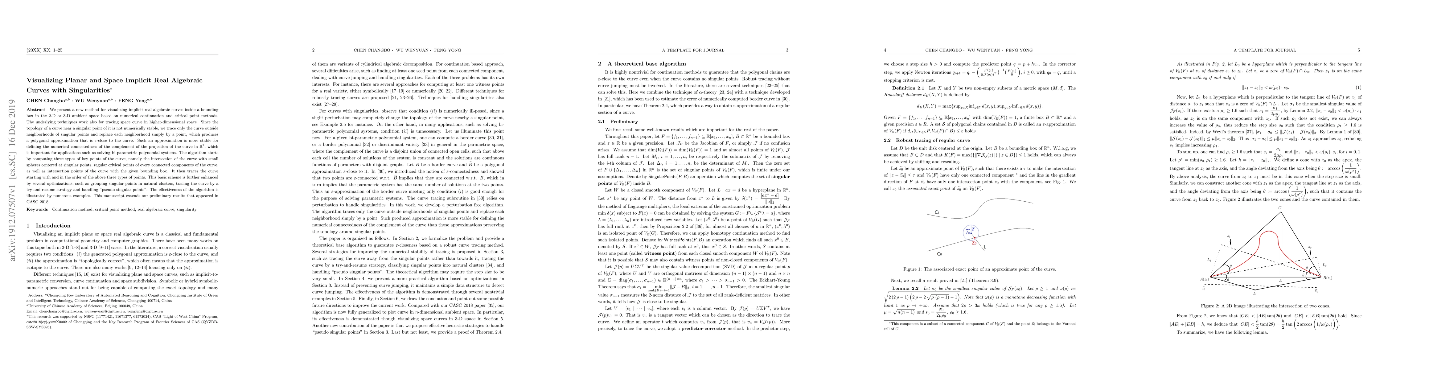 Researchers developed a method to visualize implicit real algebraic curves with singularities in 2D and 3D space using numerical continuation and critical point methods, creating stable polygonal approximations for curve tracing and solving polynomial systems.