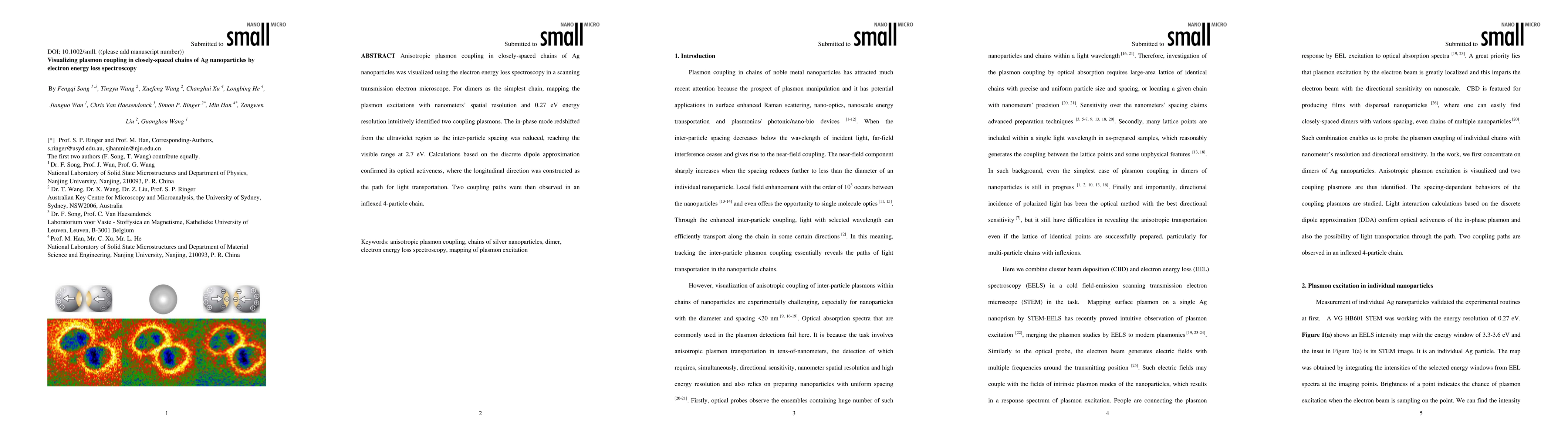 This study visualizes anisotropic plasmon coupling in closely-spaced Ag nanoparticle chains using electron energy loss spectroscopy in a scanning transmission electron microscope. The findings reveal two coupling plasmons, with the in-phase mode redshifting into the visible range as inter-particle spacing decreases, confirmed by discrete dipole approximation calculations.
