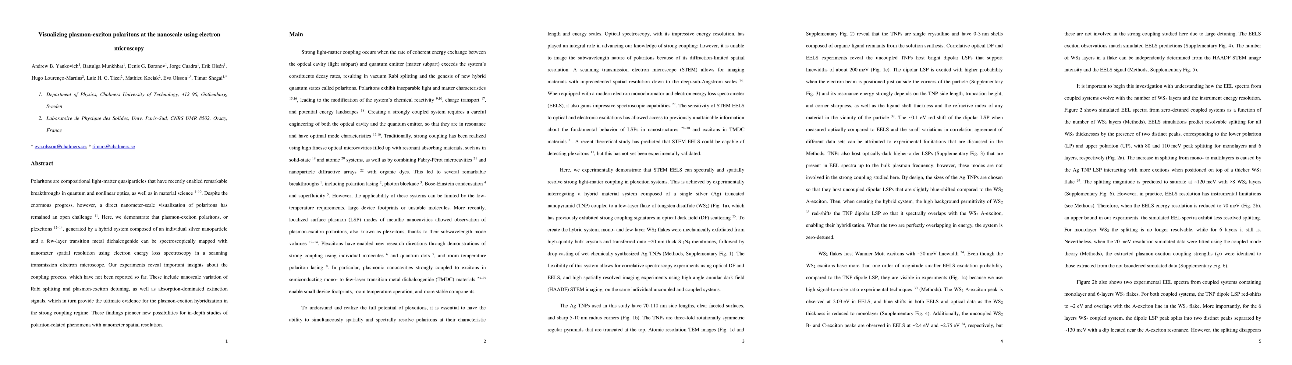 This paper demonstrates the visualization of plasmon-exciton polaritons, or plexcitons, at the nanoscale using electron microscopy, revealing insights into their coupling process and providing evidence of plasmon-exciton hybridization. The study employs electron energy loss spectroscopy in a scanning transmission electron microscope to achieve nanometer spatial resolution.