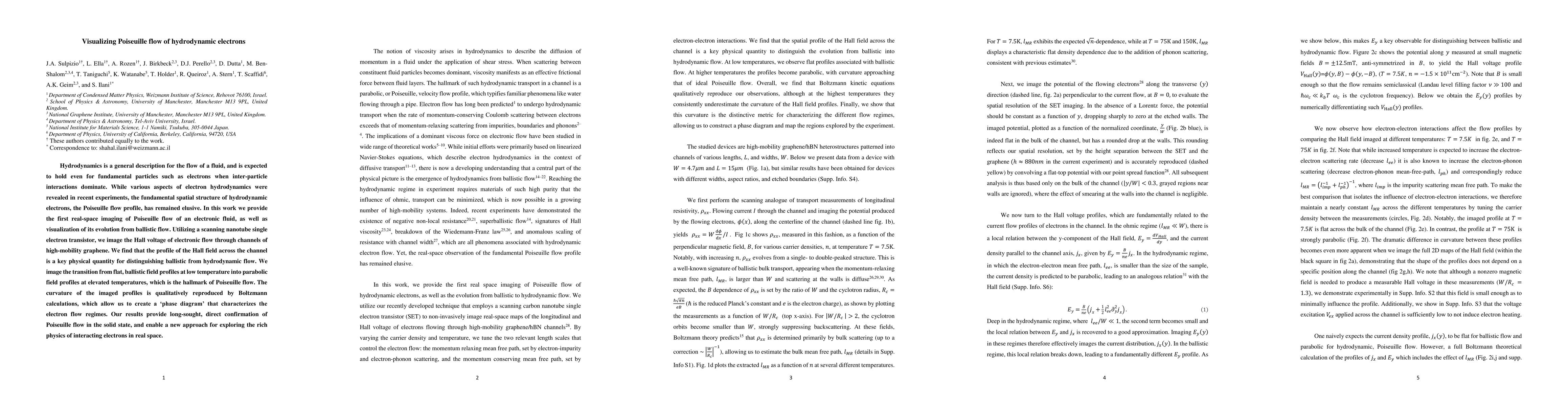 This paper presents the first real-space imaging of Poiseuille flow in hydrodynamic electrons using a scanning nanotube single electron transistor, revealing the transition from ballistic to hydrodynamic flow through the visualization of Hall voltage profiles in high-mobility graphene channels. The study provides a 'phase diagram' characterizing electron flow regimes and confirms Poiseuille flow in solid-state systems.