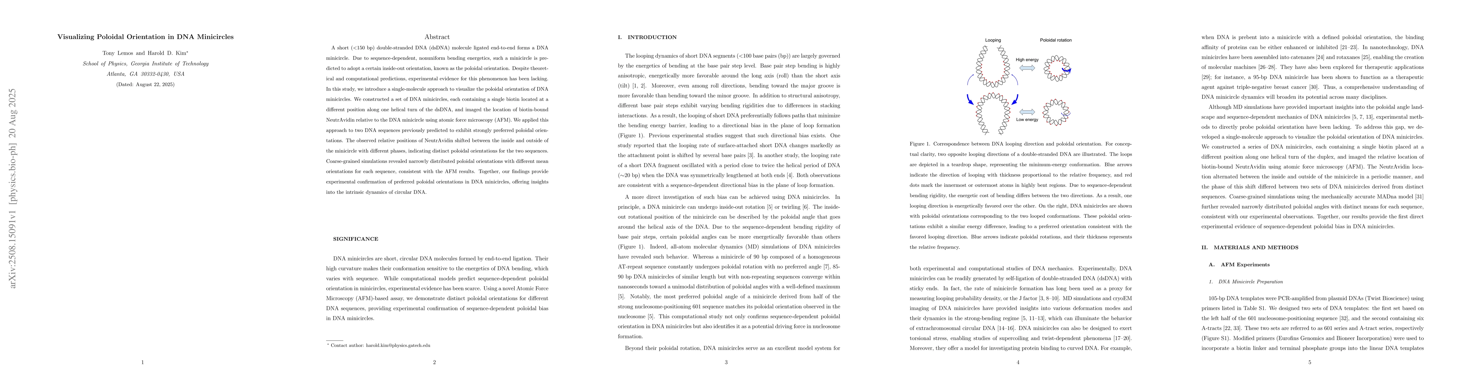 A short (<150 bp) double-stranded DNA (dsDNA) molecule ligated end-to-end forms a DNA minicircle. Due to sequence-dependent, nonuniform bending energetics, such a minicircle is predicted to adopt a certain inside-out orientation, known as the poloidal orientation. Despite theoretical and computational predictions, experimental evidence for this phenomenon has been lacking. In this study, we introduce a single-molecule approach to visualize the poloidal orientation of DNA minicircles. We constructed a set of DNA minicircles, each containing a single biotin located at a different position along one helical turn of the dsDNA, and imaged the location of biotin-bound NeutrAvidin relative to the DNA minicircle using atomic force microscopy (AFM). We applied this approach to two DNA sequences previously predicted to exhibit strongly preferred poloidal orientations. The observed relative positions of NeutrAvidin shifted between the inside and outside of the minicircle with different phases, indicating distinct poloidal orientations for the two sequences. Coarse-grained simulations revealed narrowly distributed poloidal orientations with different mean orientations for each sequence, consistent with the AFM results. Together, our findings provide experimental confirmation of preferred poloidal orientations in DNA minicircles, offering insights into the intrinsic dynamics of circular DNA.