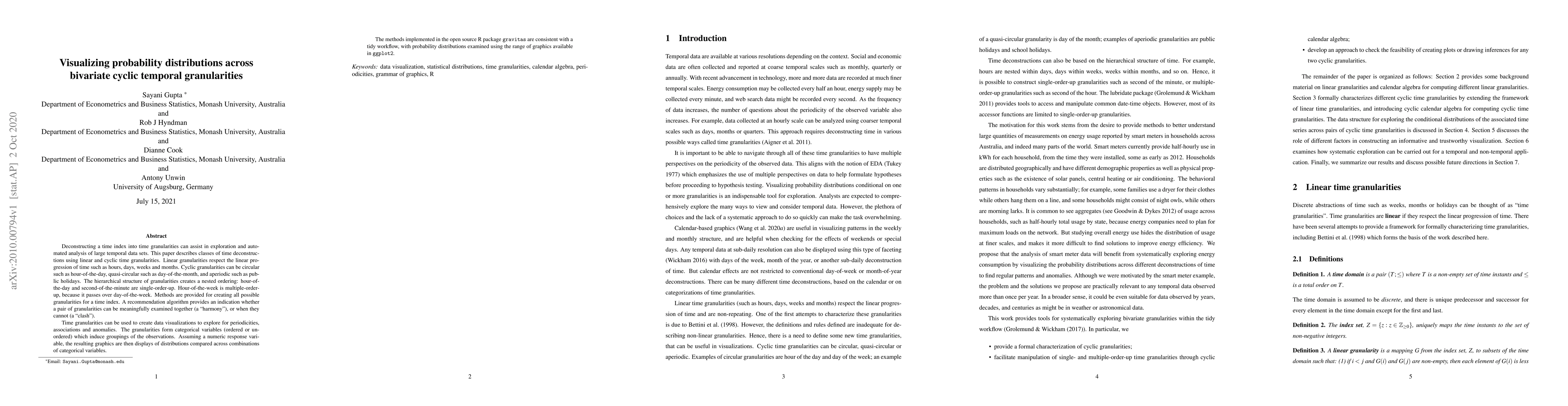 Deconstructing a time index into time granularities can assist in exploration and automated analysis of large temporal data sets. This paper describes classes of time deconstructions using linear and cyclic time granularities. Linear granularities respect the linear progression of time such as hours, days, weeks and months. Cyclic granularities can be circular such as hour-of-the-day, quasi-circular such as day-of-the-month, and aperiodic such as public holidays. The hierarchical structure of granularities creates a nested ordering: hour-of-the-day and second-of-the-minute are single-order-up. Hour-of-the-week is multiple-order-up, because it passes over day-of-the-week. Methods are provided for creating all possible granularities for a time index. A recommendation algorithm provides an indication whether a pair of granularities can be meaningfully examined together (a "harmony"), or when they cannot (a "clash"). Time granularities can be used to create data visualizations to explore for periodicities, associations and anomalies. The granularities form categorical variables (ordered or unordered) which induce groupings of the observations. Assuming a numeric response variable, the resulting graphics are then displays of distributions compared across combinations of categorical variables. The methods implemented in the open source R package `gravitas` are consistent with a tidy workflow, with probability distributions examined using the range of graphics available in `ggplot2`.