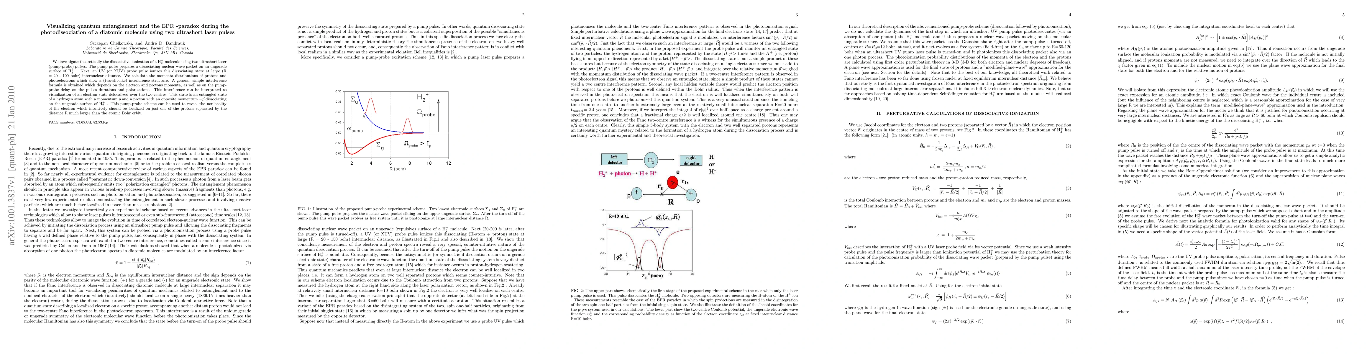 We investigate theoretically the dissociative ionization of a H2+ molecule using two ultrashort laser (pump-probe) pulses. The pump pulse prepares a dissociating nuclear wave packet on an ungerade surface of H2+. Next, an UV (or XUV) probe pulse ionizes this dissociating state at large (R = 20 - 100 bohr) internuclear distance. We calculate the momenta distributions of protons and photoelectrons which show a (two-slit-like) interference structure. A general, simple interference formula is obtained which depends on the electron and protons momenta, as well as on the pump-probe delay on the pulses durations and polarizations. This interference can be interpreted as visualization of an electron state delocalized over the two-centres. This state is an entangled state of a hydrogen atom with a momentum p and a proton with an opposite momentum. -p dissociating on the ungerade surface of H2+. This pump-probe scheme can be used to reveal the nonlocality of the electron which intuitively should be localized on just one of the protons separated by the distance R much larger than the atomic Bohr orbit.