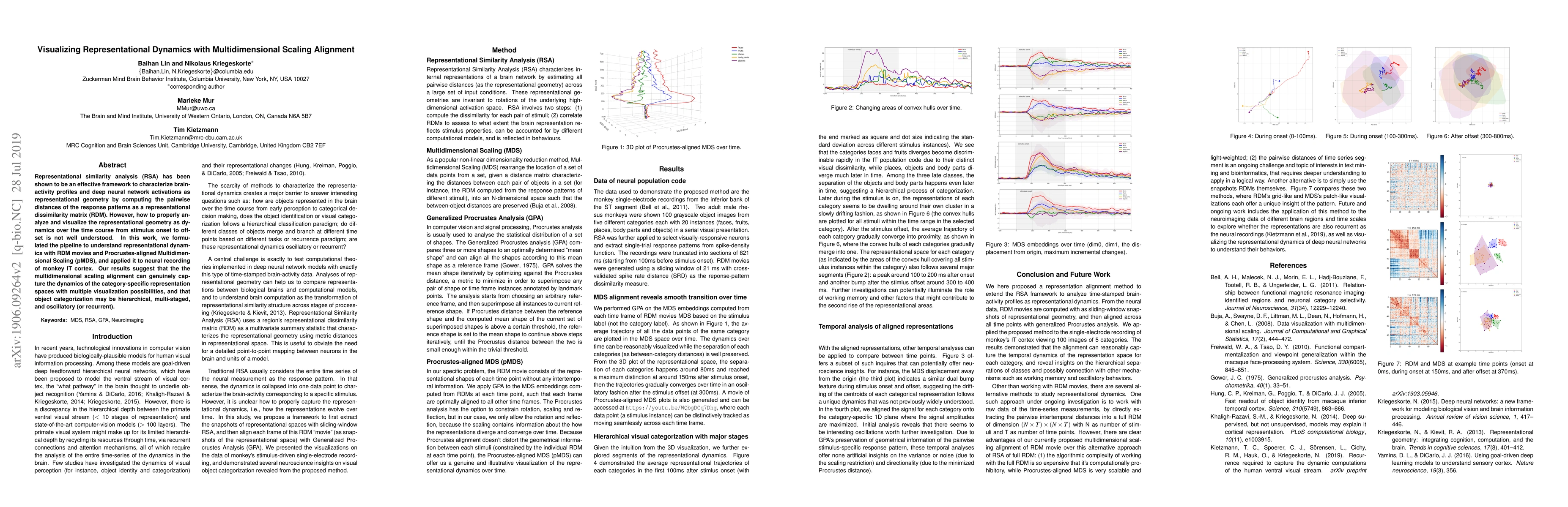 This paper proposes a method using representational dissimilarity matrices (RDMs) and Procrustes-aligned Multidimensional Scaling (pMDS) to visualize the dynamic changes in representational geometry over time in neural activity. The approach is demonstrated through neural recordings in monkey IT cortex, revealing hierarchical, multi-staged, and oscillatory patterns in object categorization.