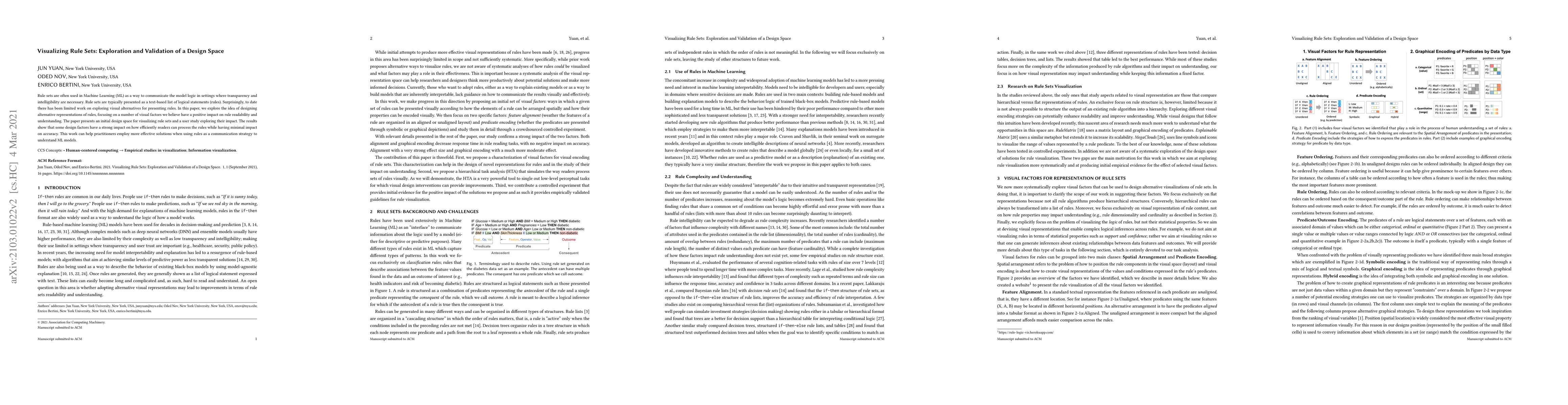 This paper explores alternative visual representations for rule sets in Machine Learning to enhance transparency and readability. It presents a design space and a user study showing that certain visual factors significantly improve rule processing efficiency without compromising accuracy.