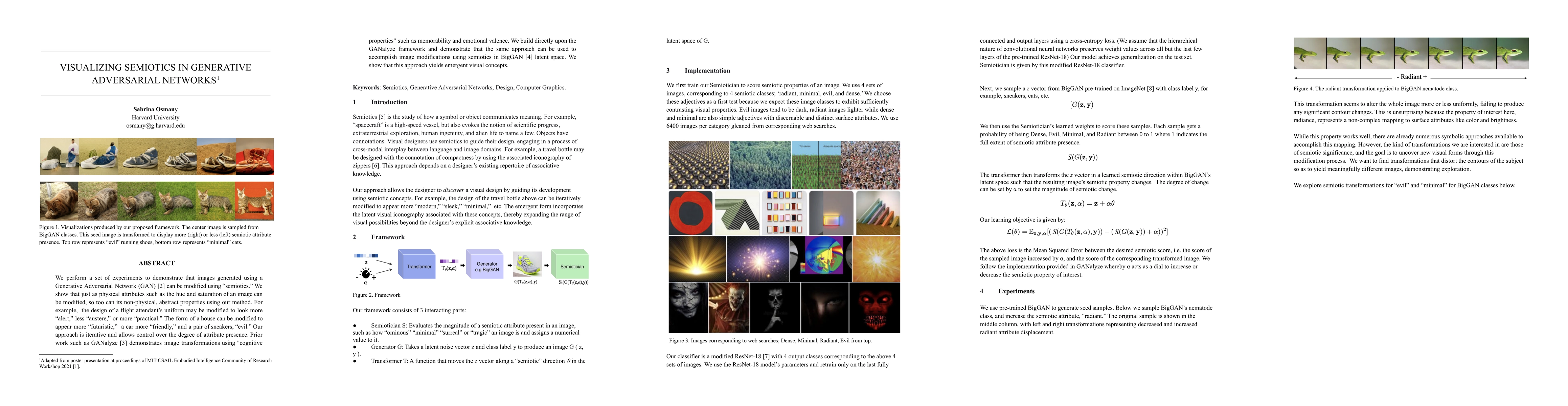 We perform a set of experiments to demonstrate that images generated using a Generative Adversarial Network can be modified using 'semiotics.' We show that just as physical attributes such as the hue and saturation of an image can be modified, so too can its non-physical, abstract properties using our method. For example, the design of a flight attendant's uniform may be modified to look more 'alert,' less 'austere,' or more 'practical.' The form of a house can be modified to appear more 'futuristic,' a car more 'friendly' a pair of sneakers, 'evil.' Our method uncovers latent visual iconography associated with the semiotic property of interest, enabling a process of visual form-finding using abstract concepts. Our approach is iterative and allows control over the degree of attribute presence and can be used to aid the design process to yield emergent visual concepts.