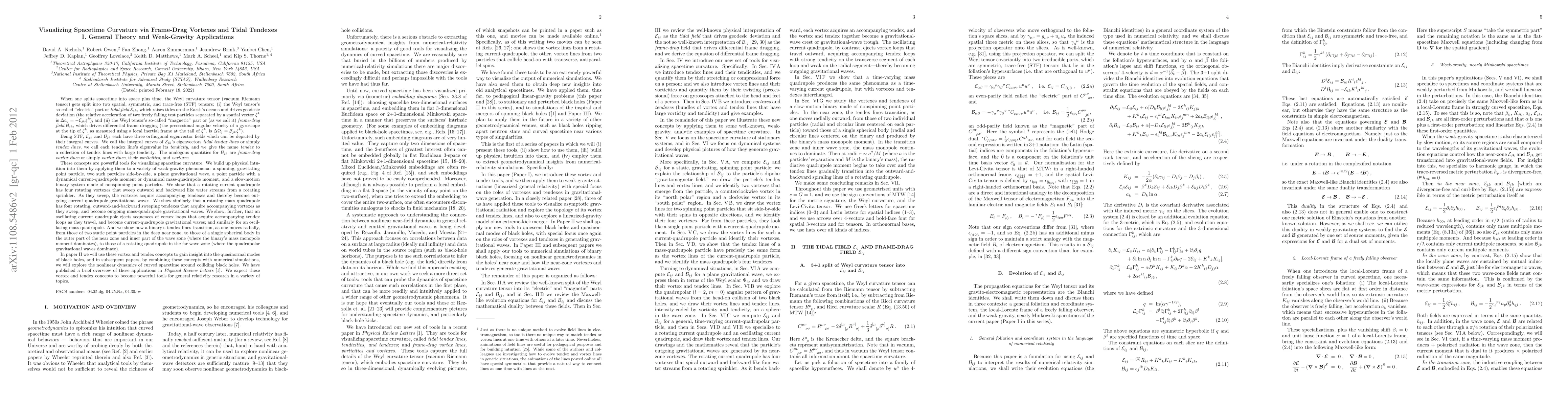 When one splits spacetime into space plus time, the Weyl curvature tensor (vacuum Riemann tensor) gets split into two spatial, symmetric, and trace-free (STF) tensors: (i) the Weyl tensor's so-called "electric" part or tidal field, and (ii) the Weyl tensor's so-called "magnetic" part or frame-drag field. Being STF, the tidal field and frame-drag field each have three orthogonal eigenvector fields which can be depicted by their integral curves. We call the integral curves of the tidal field's eigenvectors tendex lines, we call each tendex line's eigenvalue its tendicity, and we give the name tendex to a collection of tendex lines with large tendicity. The analogous quantities for the frame-drag field are vortex lines, their vorticities, and vortexes. We build up physical intuition into these concepts by applying them to a variety of weak-gravity phenomena: a spinning, gravitating point particle, two such particles side by side, a plane gravitational wave, a point particle with a dynamical current-quadrupole moment or dynamical mass-quadrupole moment, and a slow-motion binary system made of nonspinning point particles. [Abstract is abbreviated; full abstract also mentions additional results.]