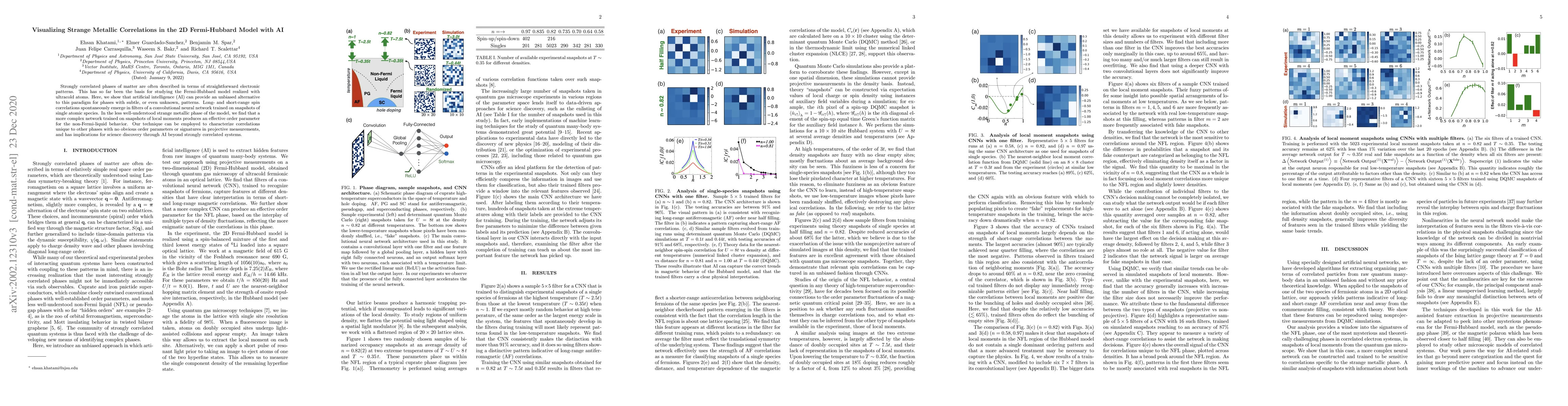 Strongly correlated phases of matter are often described in terms of straightforward electronic patterns. This has so far been the basis for studying the Fermi-Hubbard model realized with ultracold atoms. Here, we show that artificial intelligence (AI) can provide an unbiased alternative to this paradigm for phases with subtle, or even unknown, patterns. Long- and short-range spin correlations spontaneously emerge in filters of a convolutional neural network trained on snapshots of single atomic species. In the less well-understood strange metallic phase of the model, we find that a more complex network trained on snapshots of local moments produces an effective order parameter for the non-Fermi-liquid behavior. Our technique can be employed to characterize correlations unique to other phases with no obvious order parameters or signatures in projective measurements, and has implications for science discovery through AI beyond strongly correlated systems.