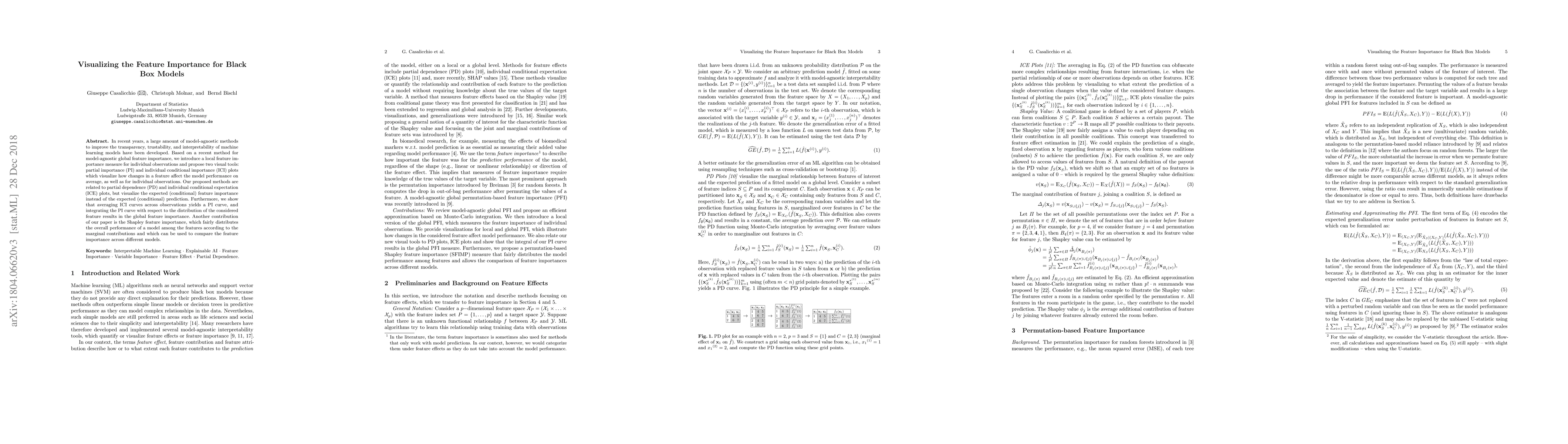 This paper introduces local feature importance methods to enhance the interpretability of black box models, proposing visual tools like partial importance and individual conditional importance plots. It also presents Shapley feature importance for fair comparison across different models.