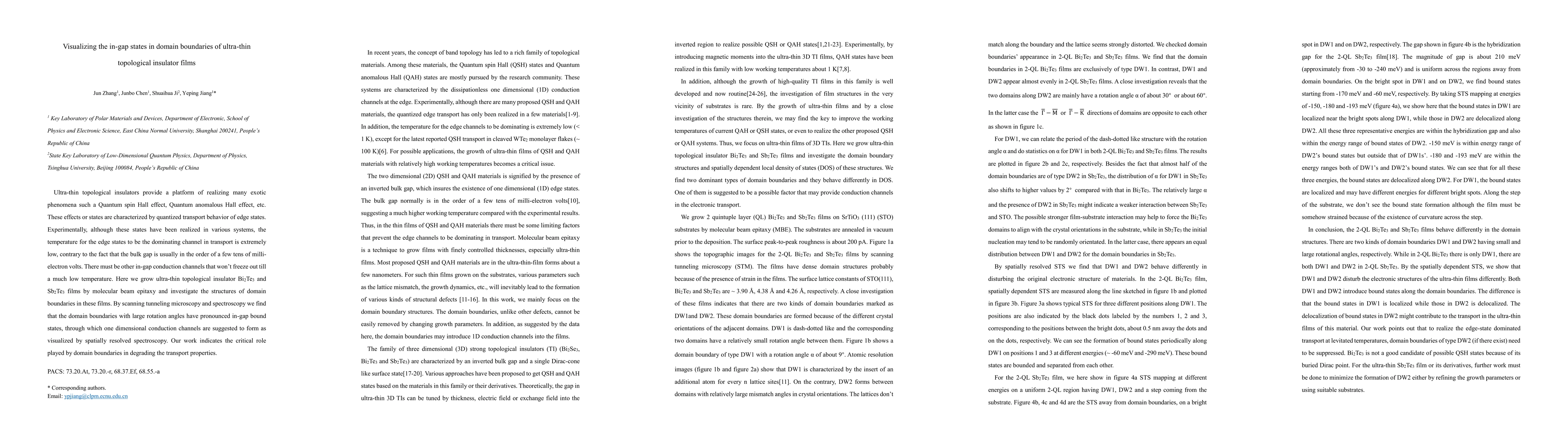 This paper investigates ultra-thin topological insulator films, specifically Bi2Te3 and Sb2Te3, grown via molecular beam epitaxy, and uses scanning tunneling microscopy to reveal pronounced in-gap bound states at domain boundaries with large rotation angles, suggesting the formation of one-dimensional conduction channels and highlighting the role of domain boundaries in degrading transport properties.