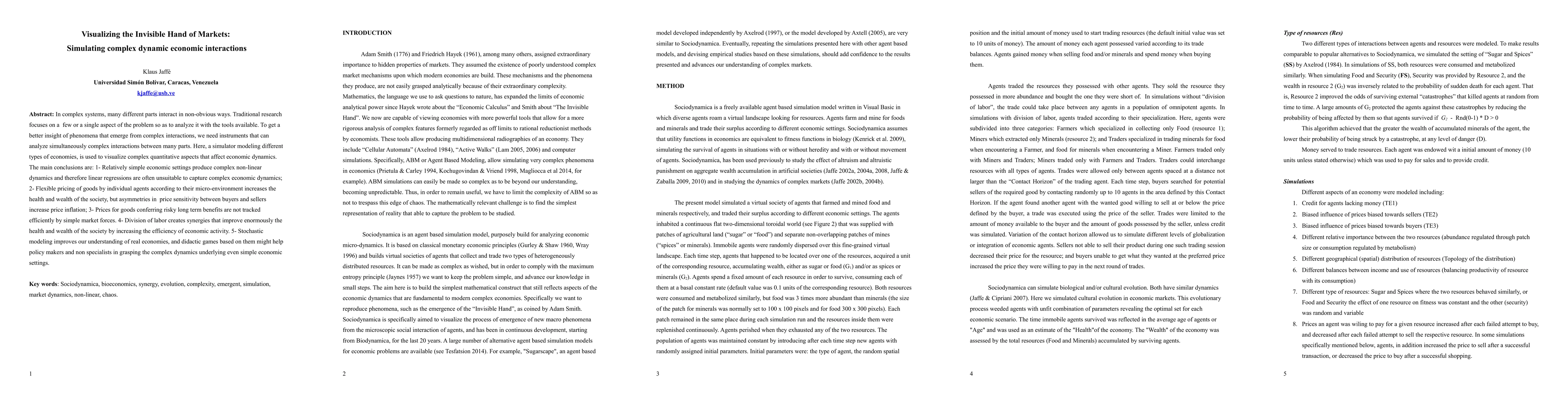 In complex systems, many different parts interact in non-obvious ways. Traditional research focuses on a few or a single aspect of the problem so as to analyze it with the tools available. To get a better insight of phenomena that emerge from complex interactions, we need instruments that can analyze simultaneously complex interactions between many parts. Here, a simulator modeling different types of economies, is used to visualize complex quantitative aspects that affect economic dynamics. The main conclusions are: 1- Relatively simple economic settings produce complex non-linear dynamics and therefore linear regressions are often unsuitable to capture complex economic dynamics; 2- Flexible pricing of goods by individual agents according to their micro-environment increases the health and wealth of the society, but asymmetries in price sensitivity between buyers and sellers increase price inflation; 3- Prices for goods conferring risky long term benefits are not tracked efficiently by simple market forces. 4- Division of labor creates synergies that improve enormously the health and wealth of the society by increasing the efficiency of economic activity. 5- Stochastic modeling improves our understanding of real economies, and didactic games based on them might help policy makers and non specialists in grasping the complex dynamics underlying even simple economic settings.