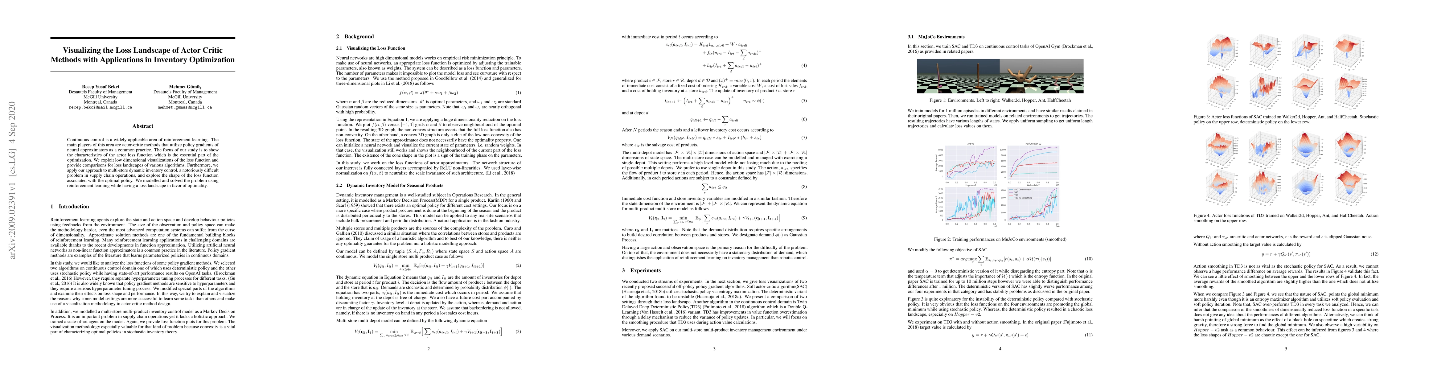 Continuous control is a widely applicable area of reinforcement learning. The main players of this area are actor-critic methods that utilize policy gradients of neural approximators as a common practice. The focus of our study is to show the characteristics of the actor loss function which is the essential part of the optimization. We exploit low dimensional visualizations of the loss function and provide comparisons for loss landscapes of various algorithms. Furthermore, we apply our approach to multi-store dynamic inventory control, a notoriously difficult problem in supply chain operations, and explore the shape of the loss function associated with the optimal policy. We modelled and solved the problem using reinforcement learning while having a loss landscape in favor of optimality.