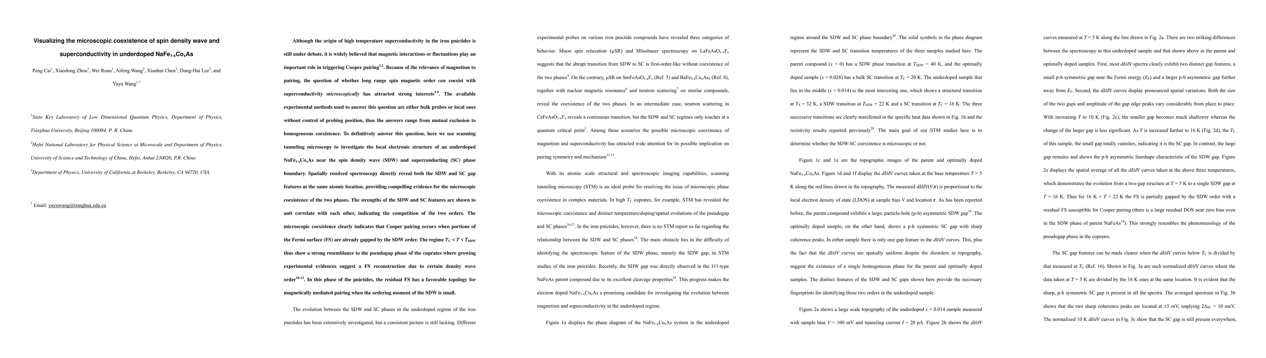 This study uses scanning tunneling microscopy to demonstrate the microscopic coexistence of spin density wave (SDW) and superconductivity in underdoped NaFe1-xCoxAs, revealing that both phases can occur at the same atomic location. The findings suggest competition between SDW and superconducting orders, with implications for understanding high-temperature superconductivity in iron pnictides.