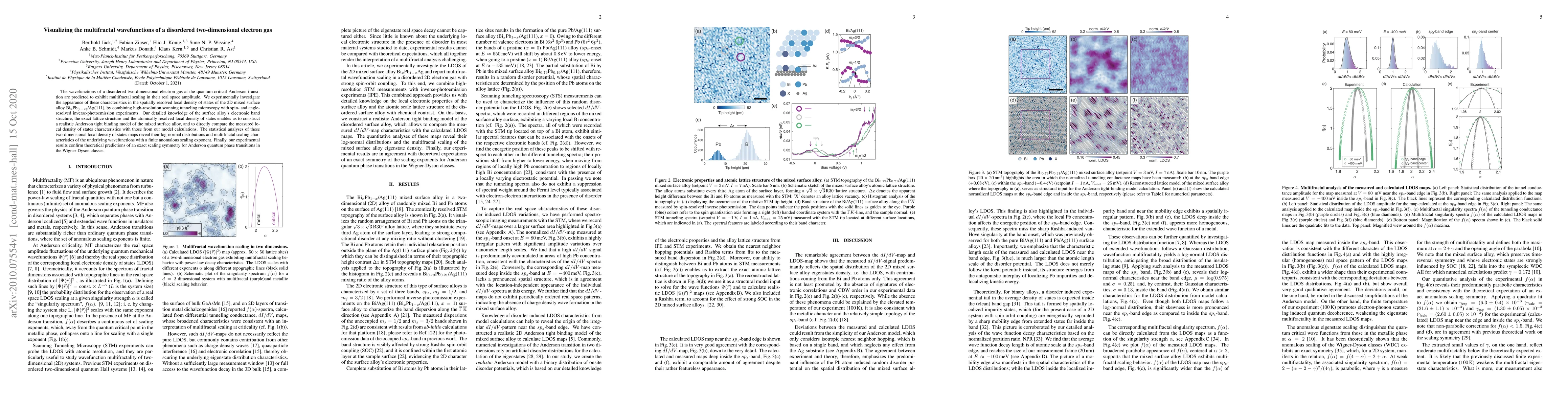 This paper investigates the multifractal scaling of wavefunctions in a disordered two-dimensional electron gas using scanning tunneling microscopy and inverse-photoemission on Bi_xPb_{1-x}/Ag(111). Experimental results confirm the predicted multifractal characteristics and log-normal distributions, supporting theoretical models of quantum phase transitions.