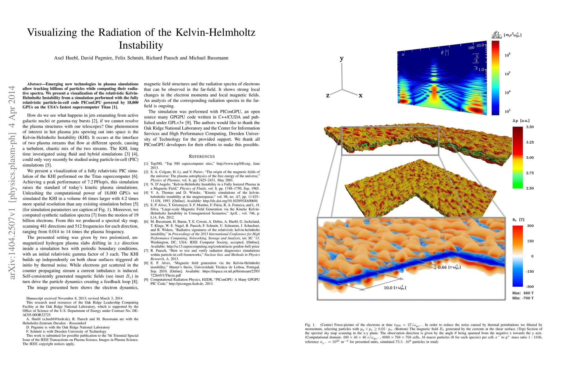 Emerging new technologies in plasma simulations allow tracking billions of particles while computing their radiative spectra. We present a visualization of the relativistic Kelvin-Helmholtz Instability from a simulation performed with the fully relativistic particle-in-cell code PIConGPU powered by 18,000 GPUs on the USA's fastest supercomputer Titan [1].
