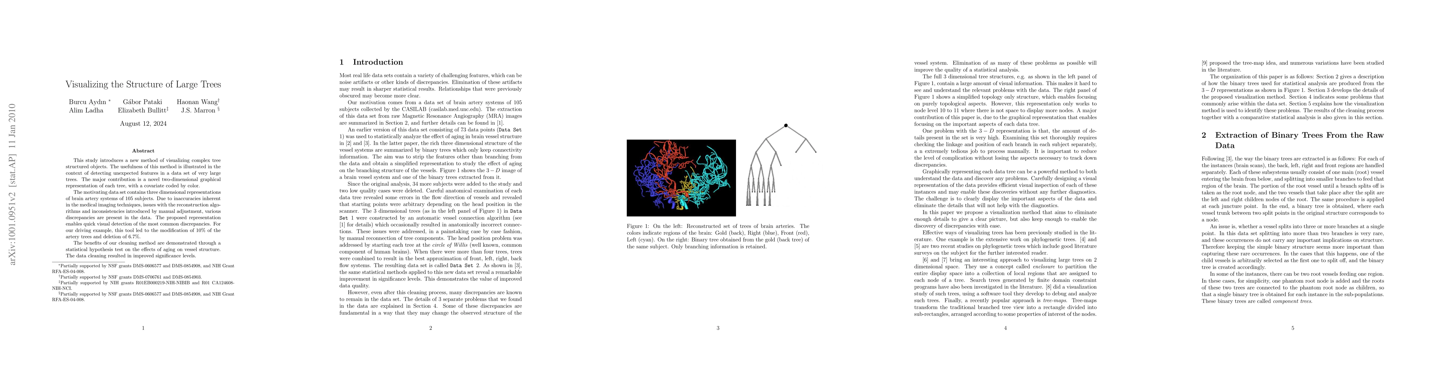 This paper presents a novel two-dimensional visualization method for large tree structures, specifically applied to brain artery systems of 105 subjects, to detect and correct discrepancies. The method improved data accuracy, leading to modifications in 10% and deletions in 6.7% of the trees, and enhanced statistical significance in aging effects studies.