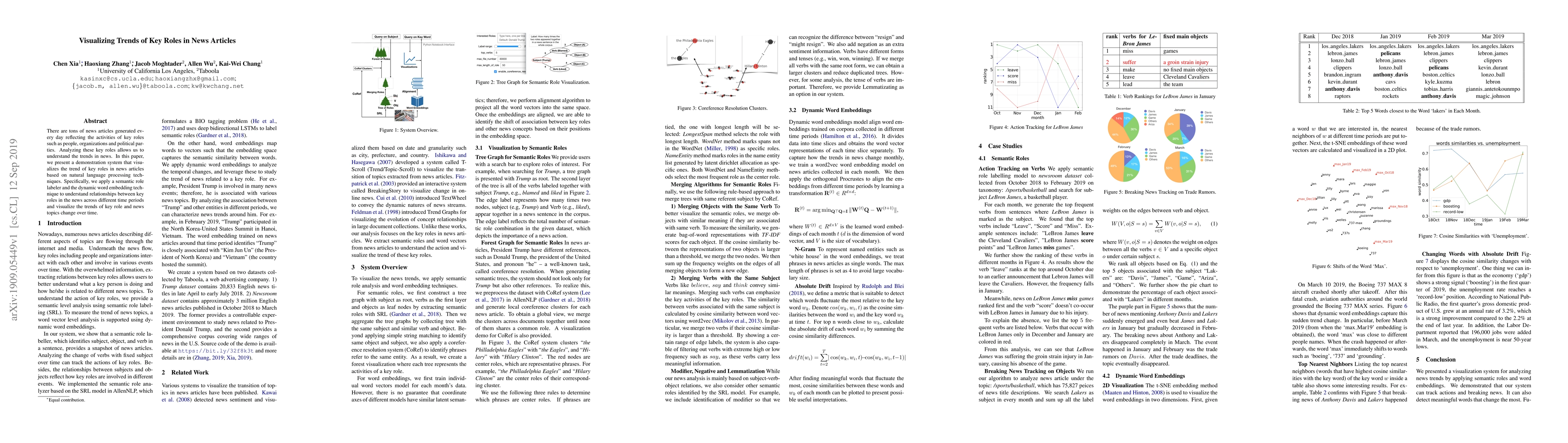 This paper presents a system that visualizes trends of key roles in news articles using natural language processing, employing semantic role labeling and dynamic word embeddings to track relationships and changes over time. The visualization helps understand shifts in key roles and news topics.