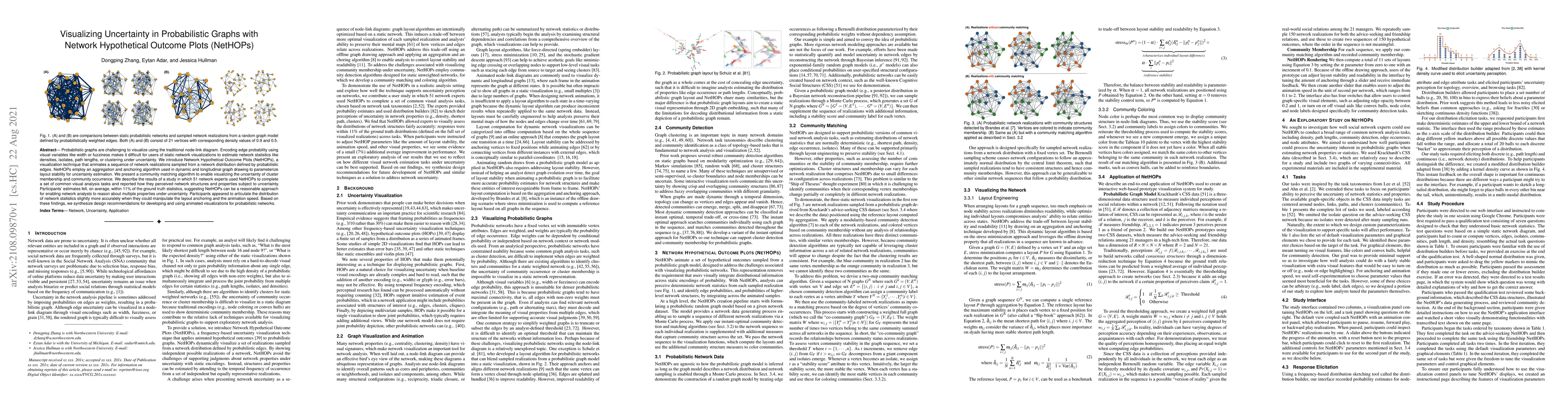 The paper introduces NetHOPs, an animated visualization technique for probabilistic graphs that samples network realizations to depict uncertainty. Participants using NetHOPs achieved accurate estimates of network statistics, suggesting it aids in reasoning about uncertain network structures.