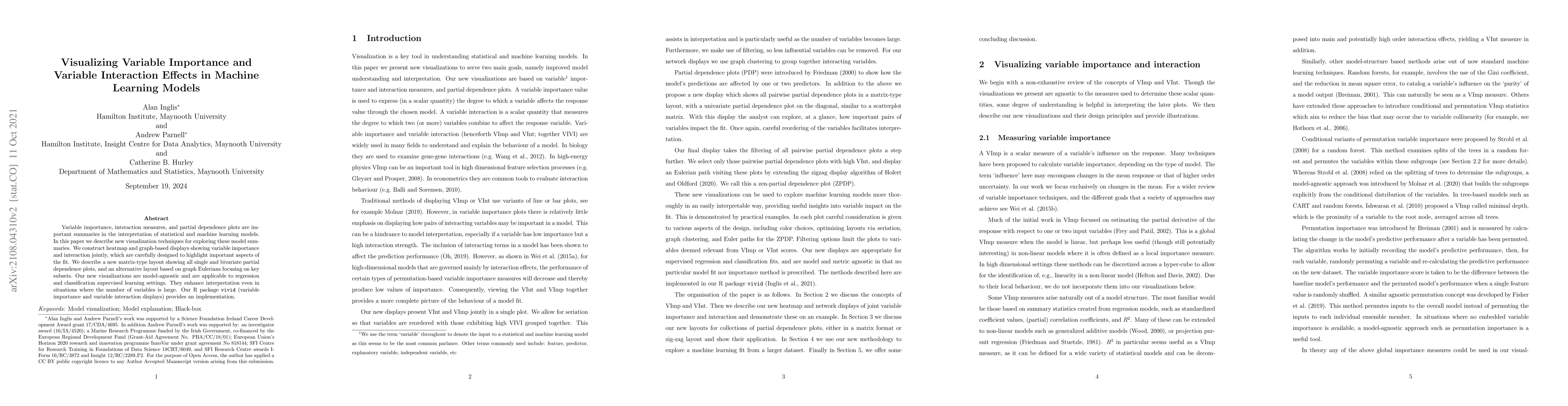 This paper introduces new visualization techniques for interpreting machine learning models, focusing on variable importance and interaction. The authors present heatmaps, graph-based displays, and matrix-type layouts for partial dependence plots, enhancing interpretability even with many variables. The R package vivid implements these visualizations, which are model-agnostic for both regression and classification tasks.