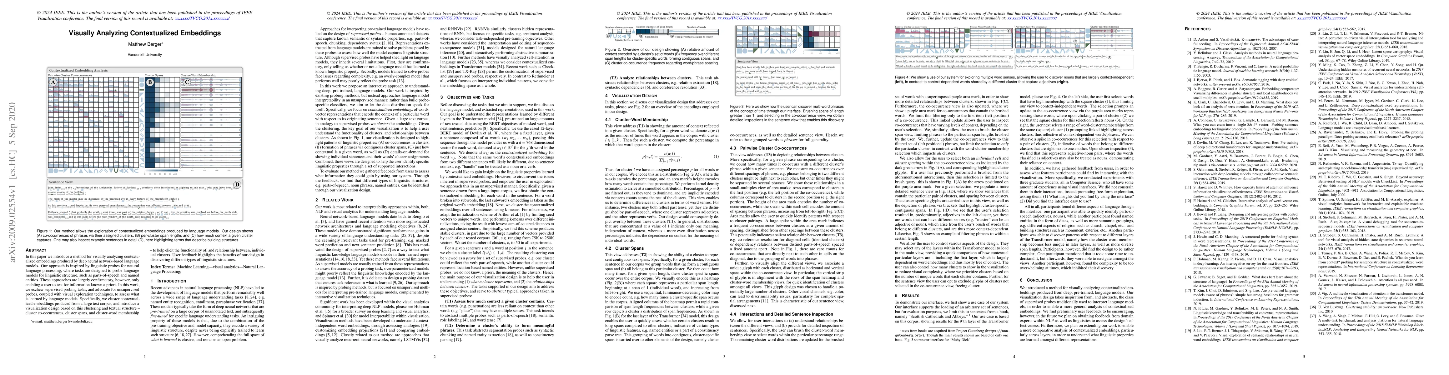 This paper presents a method for visually analyzing contextualized embeddings from deep neural network language models using unsupervised probes and visual exploration. It clusters embeddings from a large text corpus and uses visualizations based on clustering to reveal linguistic structures, aiding in understanding the learned functionalities and relationships between clusters.
