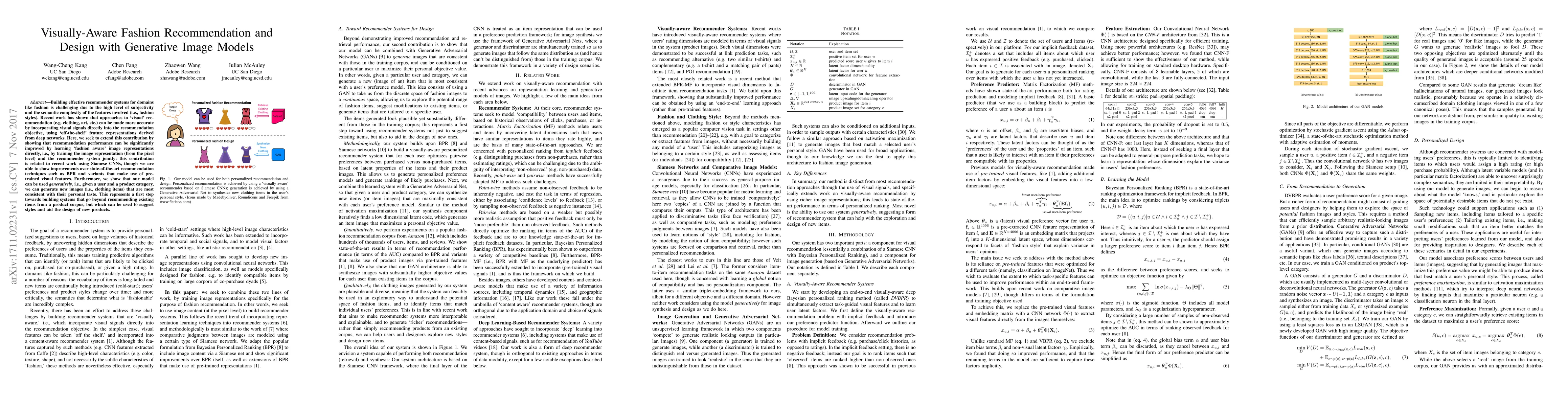 Building effective recommender systems for domains like fashion is challenging due to the high level of subjectivity and the semantic complexity of the features involved (i.e., fashion styles). Recent work has shown that approaches to `visual' recommendation (e.g.~clothing, art, etc.) can be made more accurate by incorporating visual signals directly into the recommendation objective, using `off-the-shelf' feature representations derived from deep networks. Here, we seek to extend this contribution by showing that recommendation performance can be significantly improved by learning `fashion aware' image representations directly, i.e., by training the image representation (from the pixel level) and the recommender system jointly; this contribution is related to recent work using Siamese CNNs, though we are able to show improvements over state-of-the-art recommendation techniques such as BPR and variants that make use of pre-trained visual features. Furthermore, we show that our model can be used \emph{generatively}, i.e., given a user and a product category, we can generate new images (i.e., clothing items) that are most consistent with their personal taste. This represents a first step towards building systems that go beyond recommending existing items from a product corpus, but which can be used to suggest styles and aid the design of new products.