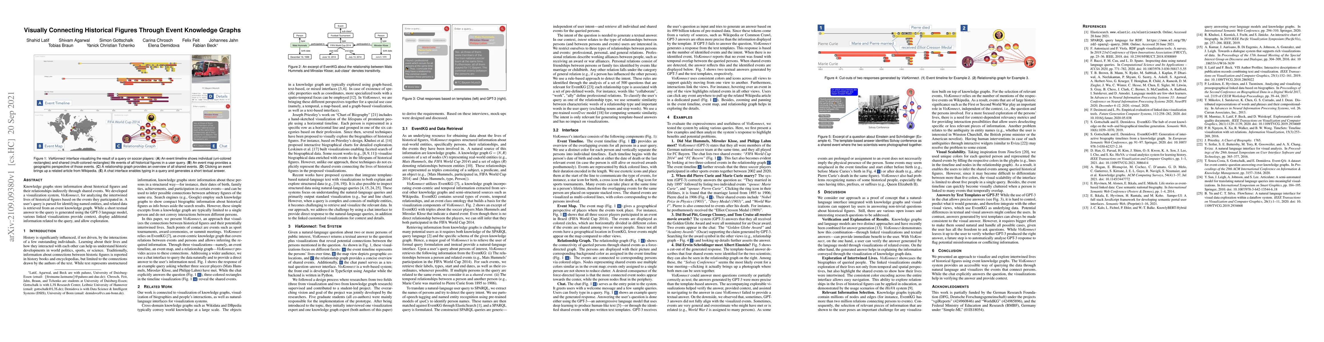 This paper introduces VisKonnect, a visualization system for analyzing historical figures' interconnected lives through shared events in a knowledge graph. It generates short textual responses using GPT-3 and provides linked visualizations for contextual exploration.