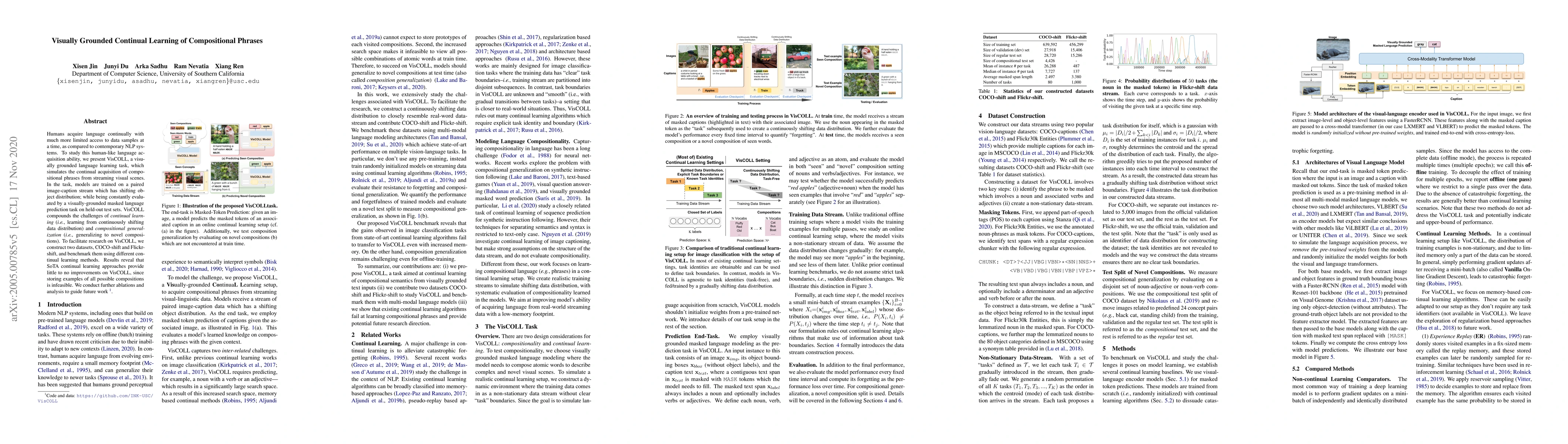 This paper introduces VisCOLL, a visually grounded continual learning task, to simulate human-like acquisition of compositional phrases from streaming visual scenes. Despite state-of-the-art continual learning methods, performance remains poor due to the infeasibility of storing all possible compositions, highlighting the need for new approaches.