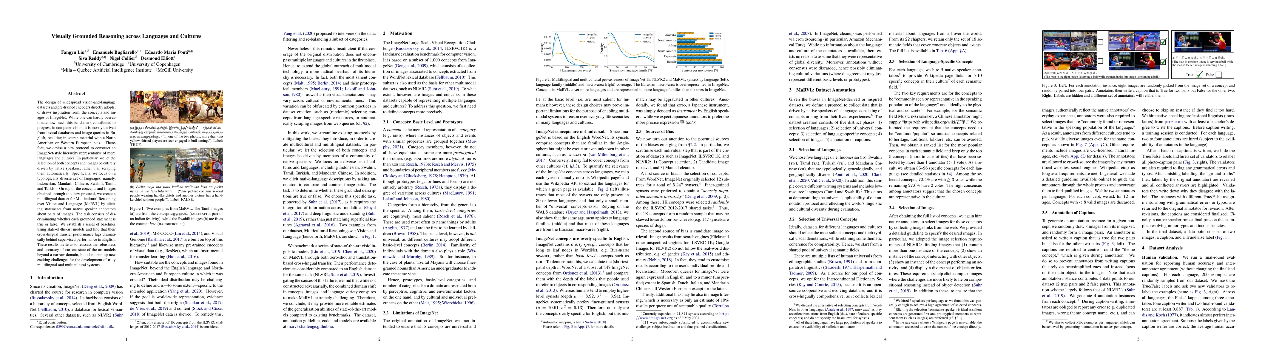 The paper introduces MaRVL, a multilingual dataset for cross-cultural visual reasoning, created with native speaker input for languages like Indonesian, Mandarin, Swahili, Tamil, and Turkish. It reveals that current state-of-the-art models struggle with cross-lingual transfer, suggesting a need for more robust, multicultural AI systems.