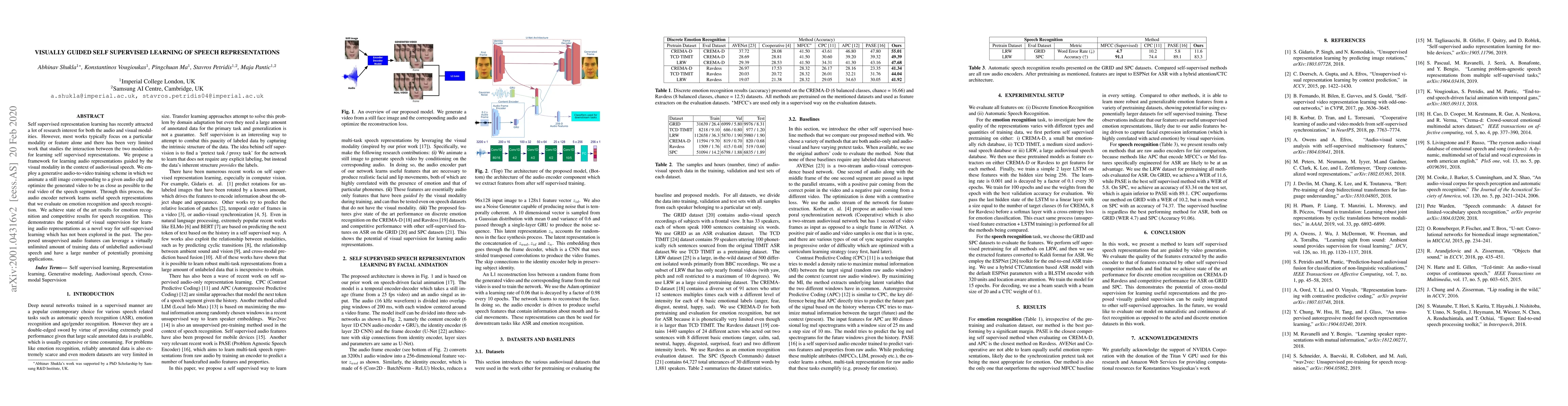 Self supervised representation learning has recently attracted a lot of research interest for both the audio and visual modalities. However, most works typically focus on a particular modality or feature alone and there has been very limited work that studies the interaction between the two modalities for learning self supervised representations. We propose a framework for learning audio representations guided by the visual modality in the context of audiovisual speech. We employ a generative audio-to-video training scheme in which we animate a still image corresponding to a given audio clip and optimize the generated video to be as close as possible to the real video of the speech segment. Through this process, the audio encoder network learns useful speech representations that we evaluate on emotion recognition and speech recognition. We achieve state of the art results for emotion recognition and competitive results for speech recognition. This demonstrates the potential of visual supervision for learning audio representations as a novel way for self-supervised learning which has not been explored in the past. The proposed unsupervised audio features can leverage a virtually unlimited amount of training data of unlabelled audiovisual speech and have a large number of potentially promising applications.